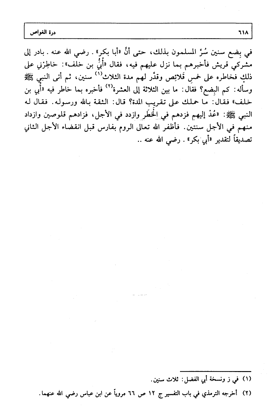 في بضع سنين سر المسلمون بذلك، حتى أن "أبا بكر". رضي الله عنه. بادر إلى مشركي قريش فأخبرهم بما نزل عليهم فيه، فقال "أبي بن خلف": خاطرني على ذلك فخاطره على خمس قلائص وقدر لهم مدة الثلاث سنين، ثم أتى النبي صلى الله عليه وسلم وسأله: كم البضع؟ فقال: ما بين الثلاثة إلى العشرة فأخبره بما خاطر فيه "أبي بن خلف" فقال: ما حملك على تقريب المدة؟ قال: الثقة بالله ورسوله. فقال له النبي صلى الله عليه وسلم: "عد إليهم فزدهم في الخطر وازدد في الأجل، فزادهم قلوصين وازداد منهم في الأجل سنتين. فأظفر الله تعالى الروم بفارس قبل انقضاء الأجل الثاني تصديقاً لتقدير "أبي بكر". رضي الله عنه ..