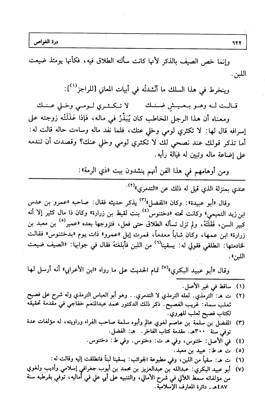 وقال "أبو عبيدة": وكان "المفضل" يذكر حديثه فقال: صاحبه "عمرو بن عدس ابن زيد التميمي" وكانت تحته "دختنوس بنت لقيط بن زرارة" وكان ذا مال كثير إلا أنه كبير السن، فقلته، ولم تزل تسأله الطلاق حتى فعل، فتزوجها بعده "عمير بن معبد بن زرارة" ابن عمها، وكان شاباً معدماً، فمرت إبل "عمرو" ذات يوم "بدختنوس" فقالت لخادمتها: انطلقي فقولي له: يسقينا من اللبن فأبلغته فقال في جوابها: "الصيف ضيعت اللبن"