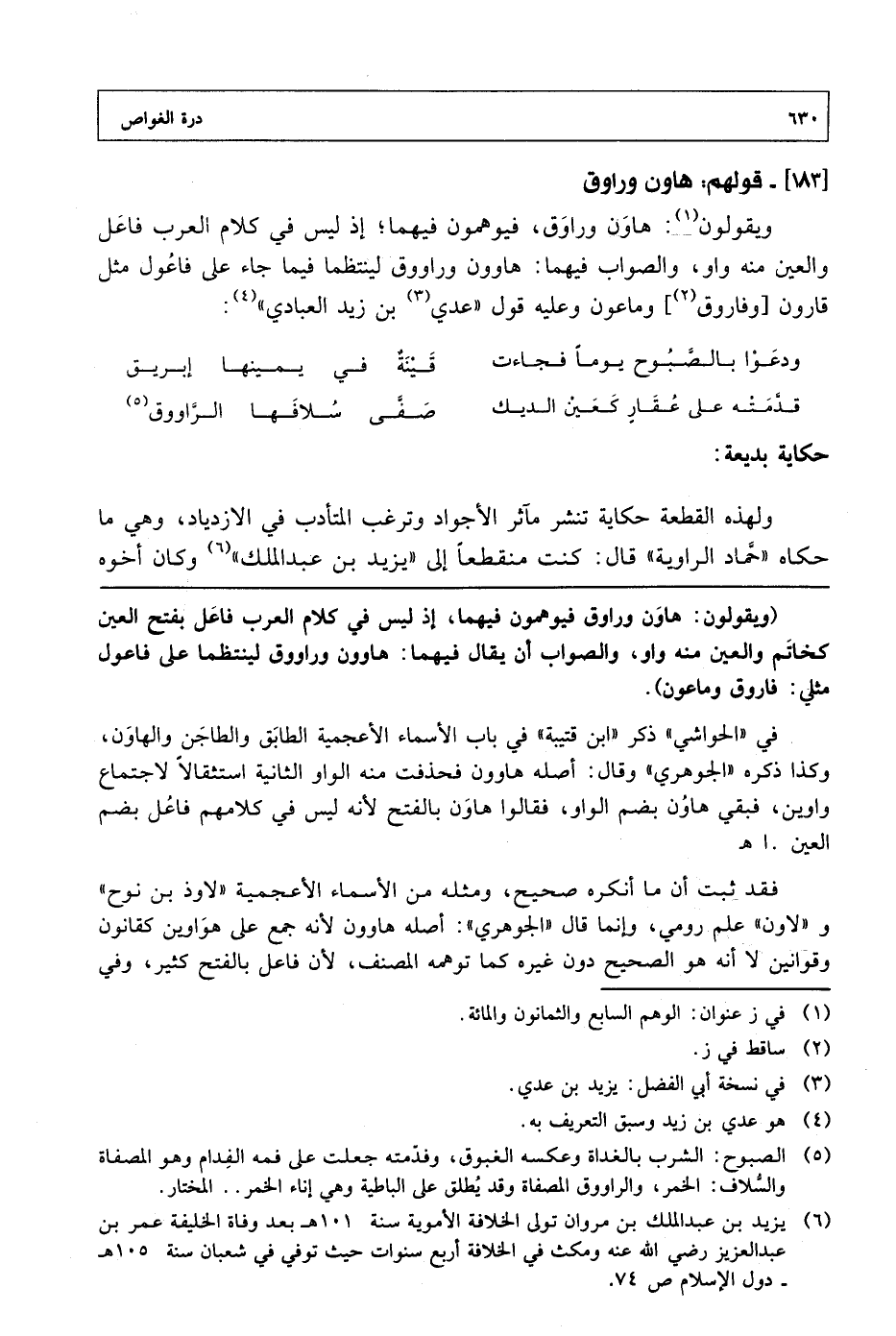 ويقولون: هاون وراوق، فيوهمن فيهما؛ إذ ليس في كلام العرب فاعل والعين منه واو، والصواب فيهما: هاوون وراووق لينتظمها فيما جاء على فاعول مثل قارون [وفاروق] وماعون وعليه قول "عدي بن زيد العبادي":