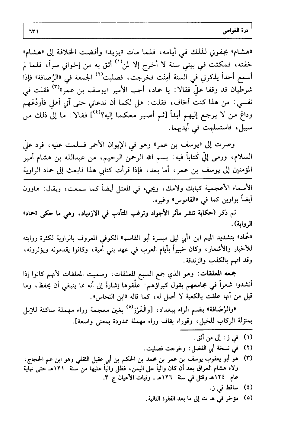 وصرت إلى "يوسف بن عمر" وهو في الإيوان الأحمر فسلمت عليه، فرد علي السلام، ورمى إلي كتاباً فيه: بسم الله الرحمن الرحيم، من عبد الله بن هشام أمير إلى يوسف بن عمر، أما بعد، فإذا قرأت كتابي هذا فابعث إلى حماد الراوية
