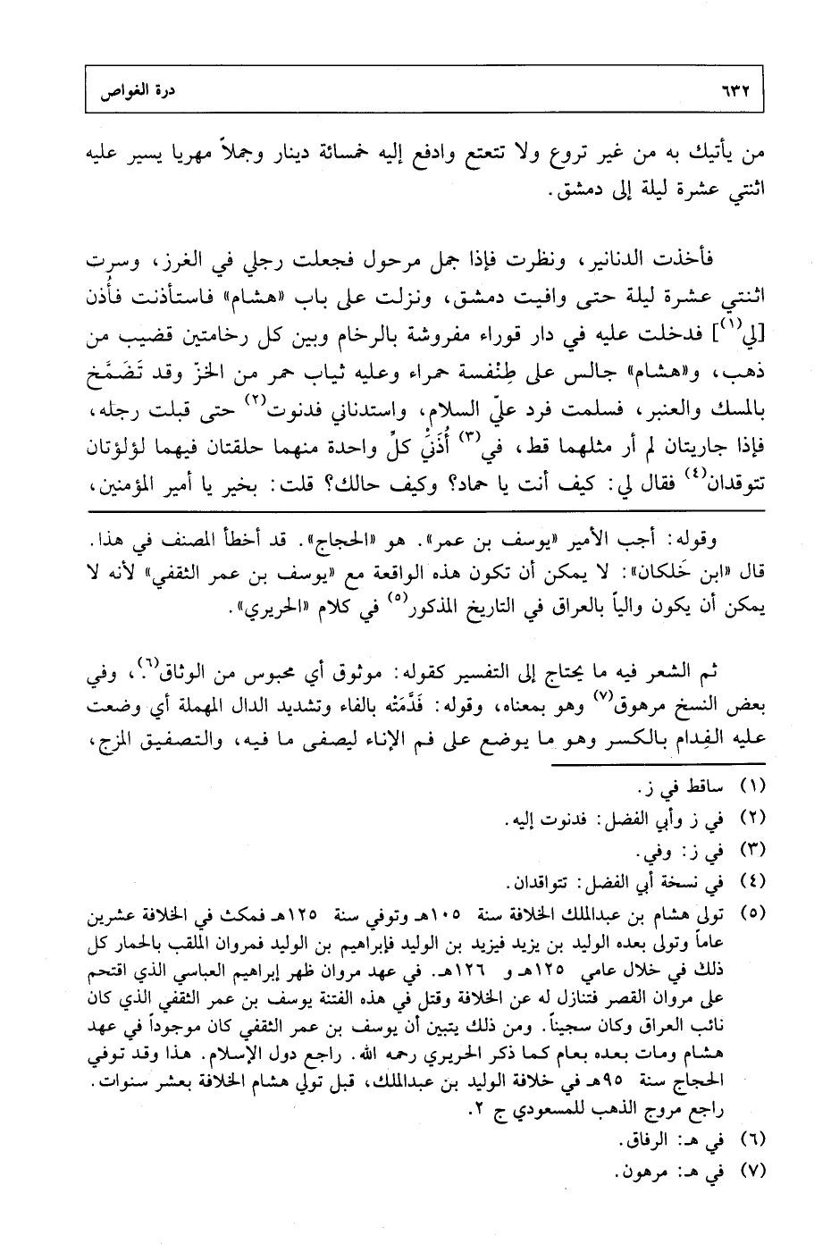 فأخذت الدنانير، ونظرت فإذا جمل مر حول فجعلت رجلي في الغرز، وسرت اثنتي عشرة ليلة حتى وافيت دمشق، ونزلت على باب "هشام" فاستأذنت فأذن [لي] فدخلت عليه في دار قوراء مفروشة بالرخام وبين كل رخامتين قضيب من ذهب، و"هشام" جالس على طنفسة حمراء وعليه ثياب حمر من الخز وقد تضمخ بالمسك والعنبر، فسلمت فرد على السلام، واستدناني فدنوت حتى قبلت رجله، فإذا جاريتان لم أر مثلهما قط، في أذني كل واحدة منهما حلقتان فيهما لؤلؤتان تتوقدان فقال لي: كيف أنت يا حماد؟ وكيف حالك؟ قلت: بخير يا أمير المؤمنين،