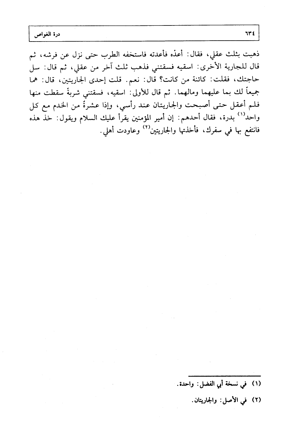 ذهبت بثلث عقلي، فقال: أعده فأعدته فاستخفه الطرب حتى نزل عن فرشه، ثم قال للجارية الأخرى: اسقيه فسقتني فذهب ثلث آخر من عقلي، ثم قال: سل حاجتك، فقلت: كائنة من كانت؟ قال: نعم. قلت إحدى الجاريتين، قال: هما جميعاً لك بما عليهما وما لهما. ثم قال للأولى: اسقيه، فسقتني شربة سقطت منها فلم أعقل حتى أصبحت والجاريتان عند رأسي، وإذا عشرة من الخدم مع كل واحد بدرة، فقال أحدهم: إن أمير المؤمنين يقرأ عليك السلام ويقول: خذ هذه فانتفع بها في سفرك، فأخذتها والجاريتين وعاودت أهلي.