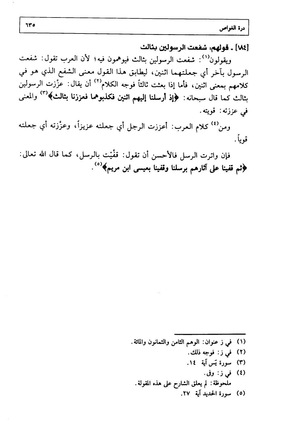 ويقولون: شفعت الرسولين بثالث فيوهمن فيه؛ لأن العرب تقول: شفعت ارسول بآخر أي جعلتهما اثنين، ليطابق هذا القول معنى الشفع الذي هو في كلامهم بمعنى اثنين، فأما إذا بعثت ثالثاً فوجه الكلام أن يقال: عززت الرسولين بثلث كما قال سبحانه: {إذ أرسلنا إليهم اثنين فكذبوهما فعززنا بثالث} [يس: 14] والمعنى في عززته: قويته.