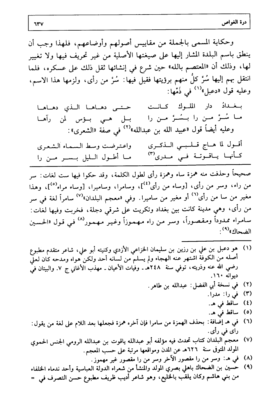 وحكاية المسمى بالجملة من مقاييس أصولهم وأوضاعهم، فلهذا وجب أن ينطق باسم البلدة المشار إليها على صيغتها الأصلية من غير تحريف فيها ولا تغيير لها، وذلك أن "المعتصم بالله" حين شرع في إنشائها ثقل ذلك على عسكره، فلما انتقل بهم إليها سر كل منهم برؤيتها فقيل فيها: سر من رأى، ولذمها هذا الاسم، وعليه قول "دعبل" في ذمها: