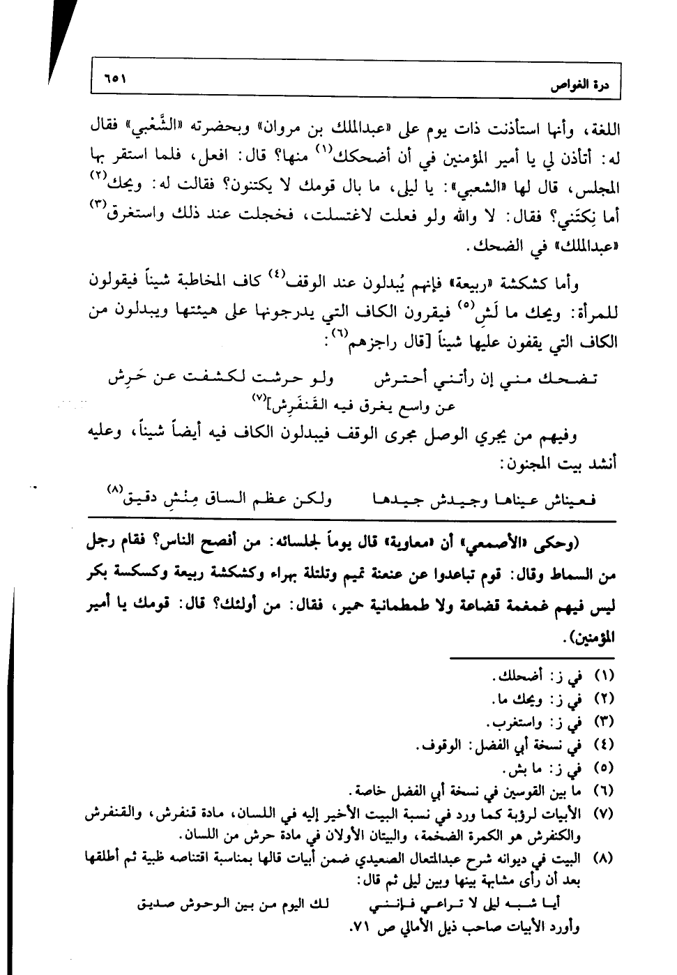 اللغة, وأنها استأذنت ذات يوم على "عبد الملك بن مروان" وبحضرته "الشعبي" فقال له: أتأذن لي يا أمير المؤمنين في أن أضحكك منها؟ قال: افعل, فلما استقر بها المجلس, قال لها "الشعبي": يا ليلى, ما بال قومك لا يكتنون؟ فقالت له: ويحك أما نكتني؟ فقال: لا والله ولو فعلت لاغتسلت, فخجلت عند ذلك واستغرق "عبد الملك" في الضحك. وأما كشكشة "ربيعة" فإنهم يبدلون عند الوقف كاف المخاطبة شيناً فيقولون للمرأة: ويحك ما لش فيقرون الكاف التي يدرجونها على هيئتها ويبدلون من الكاف التي يقفون عليها شيناً [قال راجزهم]: