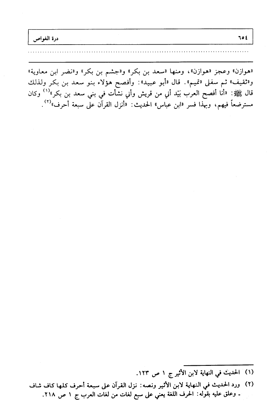 "هوازن" وعجز "هوازن" ومنها "سعد بن بكر" و"جشم بن بكر" و"نضر ابن معاوية" و"ثقيف" ثم سفلى "تميم". قال "أبو عبيد": وأفصح هؤلاء بنو سعد بن بكر ولذلك قال صلى الله عليه وسلم: "أنا أفصح العرب بيد أني من قريش وأني نشأت في بني سعد بن بكر" وكان مسترضعاً فيهم, وبهذا فسر "ابن عباس" الحديث: "أنزل القرآن على سبعة أحرف".