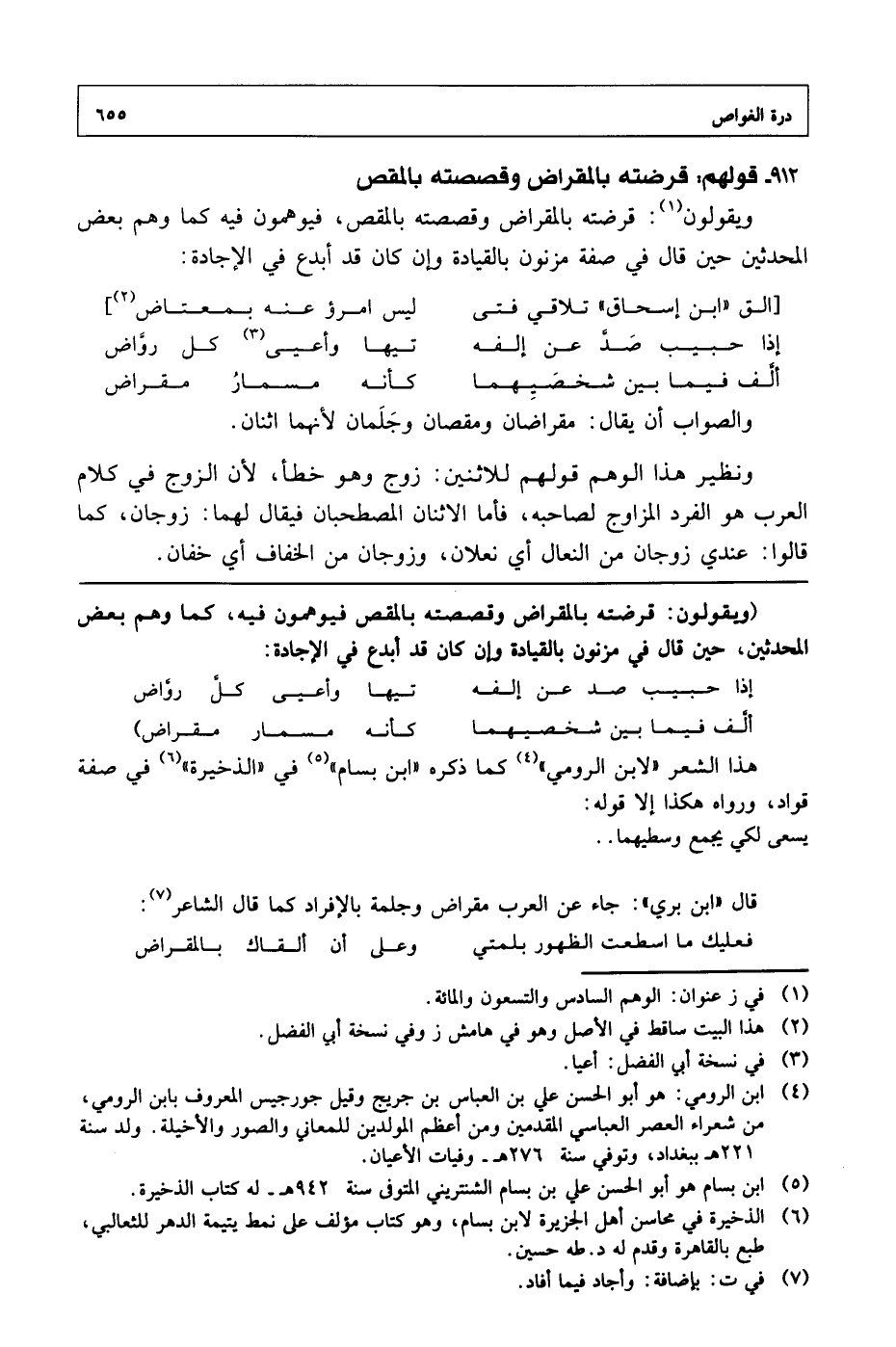 (ويقولون: قرضته بالمقراض وقصصته بالمقص فيوهمون فيه, كما وهم بعض المحدثين, حين قال في مزنوق بالقيادة وإن كان قد أبدع في الإجادة: