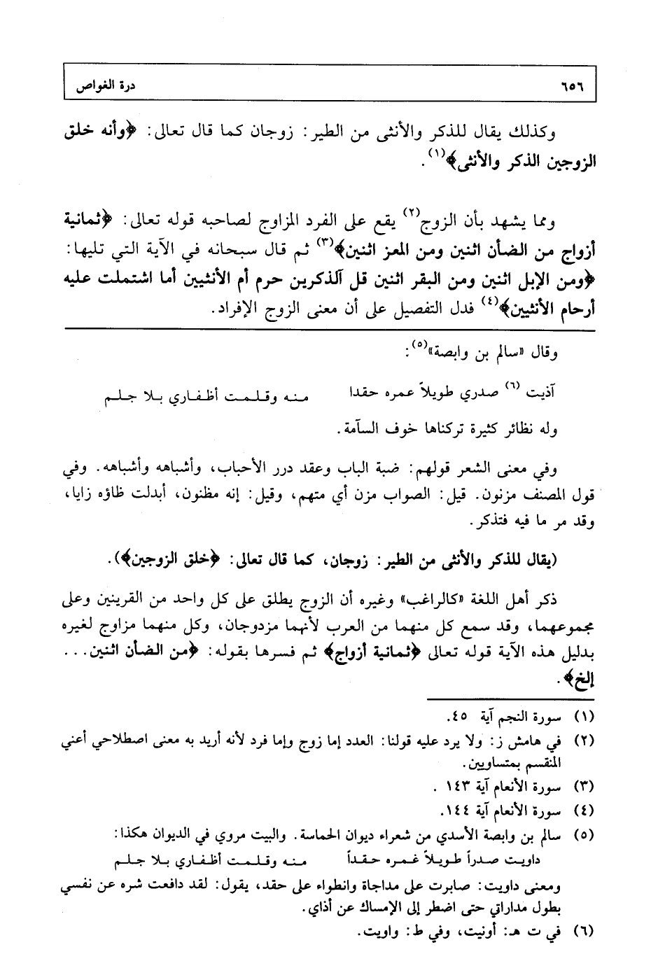 وكذلك يقال للذكر والأنثى من الطير: زوجان كما قال تعالى: {وأنه خلق الزوجين الذكر والأنثى}. ومما يشهد بأن الزوج يقع على الفرد المزواج لصاحبه قوله تعالى: {ثمانية أزواج من الضأن اثنين ومن المعز اثنين} ثم قال سبحانه في الآية التي تليها: {ومن الإبل اثنين ومن البقر اثنين قل آلذكرين حرم أم الأنثيين أما اشتملت عليه أرحام الأنثيين} فدل التفصيل على أن معنى الزوج الإفراد.
