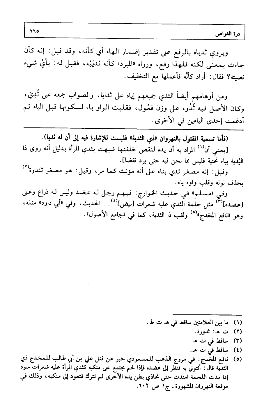 (فأما تسمية المقتول بالنهروان "ذي الثدية" فليست لإشارة فيه إلى أن له ثديا). [يعنى أن المراد به أن يده لنقص خلقتها شبهت بثدي المرأة بدليل أنه روى ذا اليدية بياء تحتية فليس مما نحن فيه حتى يرد نقصا]. وقيل: إنه مصغر ثدي بناء على أنه مؤنث كما مر, وقيل: هو مصغر ثندوة بحذف نونه وقلب واوه ياء. وفي "مسلم" في حديث الخوارج: فيهم رجل له عضد وليس له ذراع وعلى [عضده] مثل حلمة الثدي عليه شعرات [بيض] .. الحديث, وفي "أبي دواد" مثله, وهو "نافع المخدع" ولقب ذا الثدية, كما في "جامع الأصول".