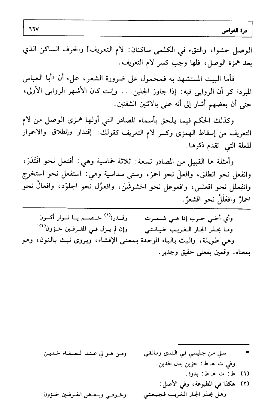 الوصل حشوا, والتقء في الكلمى ساكنان: لام التعريف] والحرف الساكن الذي بعد همزة الوصل, فلها وجب كسر لام التعريف. فأما البيت المستشهد به فمحمول على ضرورة الشعر, علء أن "أبا العباس المبرد" كر أن الروايى فيه: إذا جاوز الحلين ... وإنت كان الأشهر الروايى الأولى, حتى أن بعضهم أشار إلى أنه عني بالاثنين الشفتين. وكذلك الحكم فيما يلحق بأسماء المصادر التي أولها همزى الوصل من لام التعريف من إسقاط الهمزى وكسر لام التعريف كقولك: إقتدار وانطلاق والاحمرار للعلة التي تقدم ذكرها. وأمثلة ها القبيل من المصادر تسعة: ثلاثة خماسية وهي: أفتعل نحو اقتدر, وانفعل نحو انطلق, وافعل نحو احمر, وستى سداسية وهي: استفعل نحو استخرج وانفعلل نحو اقعنس, وافعوعل نحو اخشوشن, وافعول نحو اجلود, وافعال نحو احمار وافعلل نحو اقشعر.