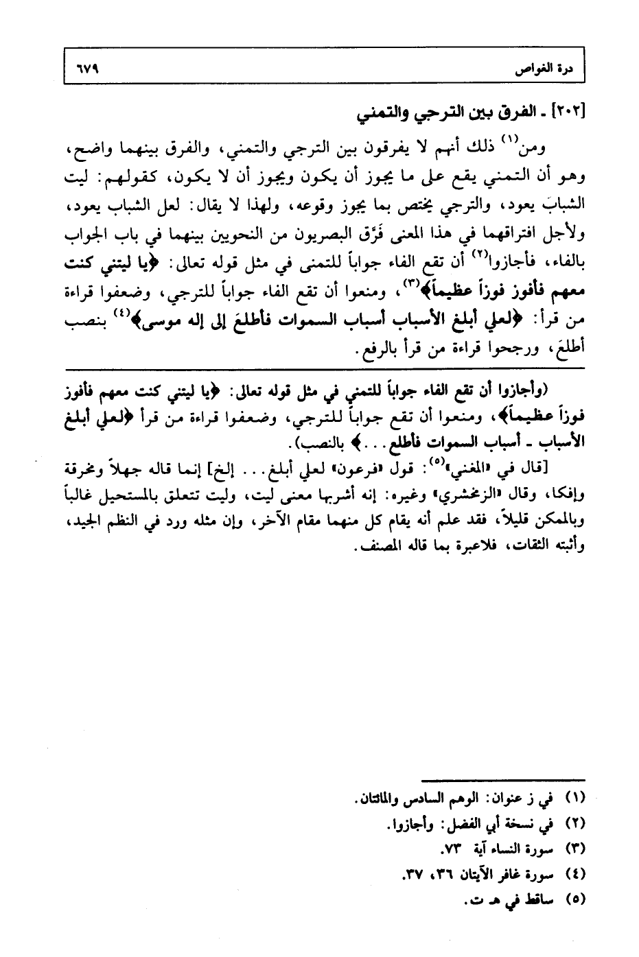 ومن ذلك أنهم لا يفرقون بين الترجي والتمني, والفرق بينهما واضح, وهو أن التمني يقع على ما يجوز أن لا يكون, كقولهم: ليت الشباب يعود, والترجي يختص بما يجوز وقوعه, لهذا لا يقال: لعل الشباب يعود, ولأجل افتراقهما في هذا المعنى فرق البصريون من النحويين بينهما في باب الجواب بالفاء, فأجازوا أن تقع الفاء جواباً للتمني في مثل قوله تعالى: {يا ليتني كنت معهم فأفوز فوزاً عظيماً} , ومنعوا أن تقع الفاء جواباً للترجي, وضعفوا قراءة من قرأ: {لعلي أبلغ الأسباب أسباب السموات فأطلع إلى إله موسى} بنصب أطلعَ, ورجحوا قراءة من قرأ بالرفع.
