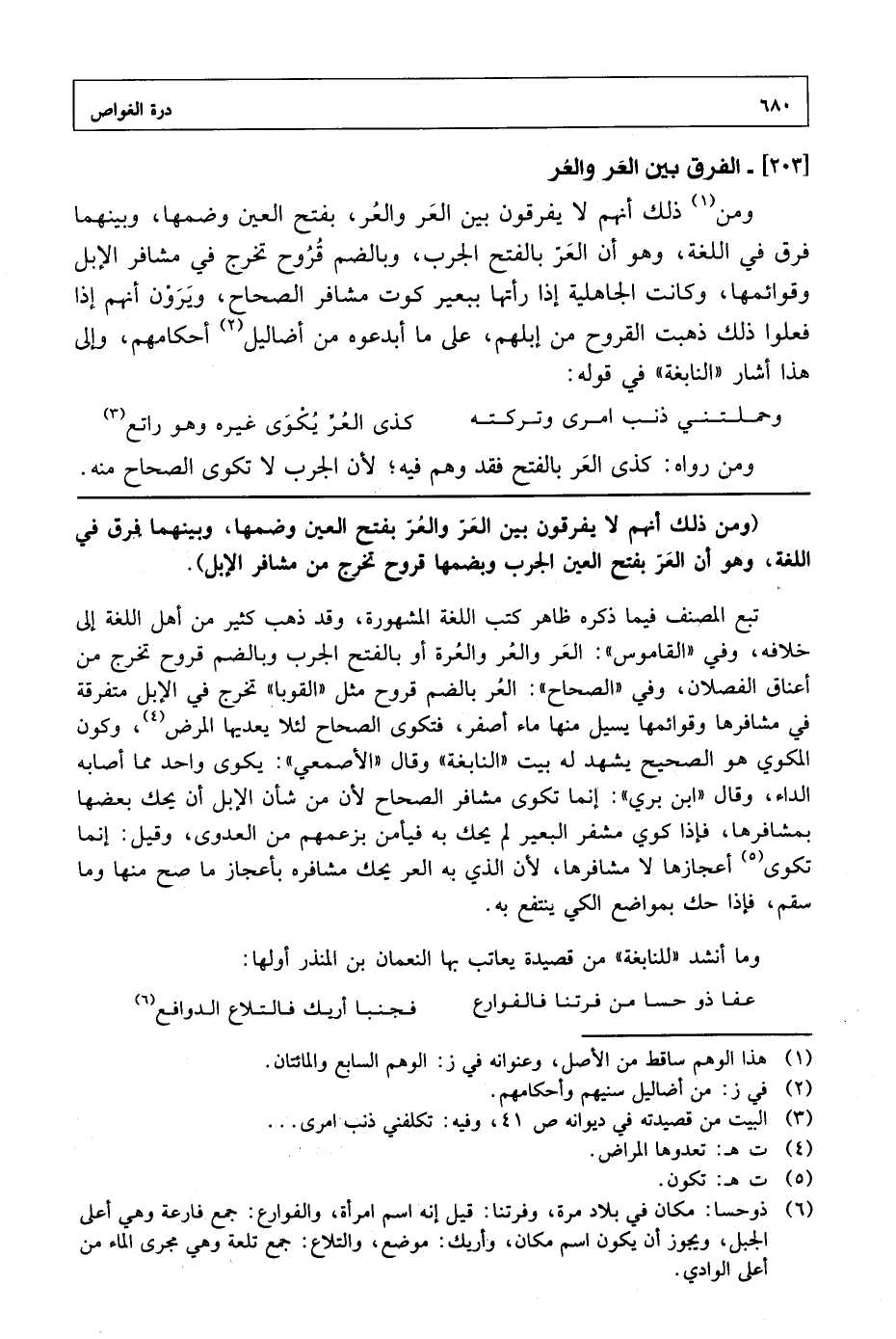 (ومن ذلك أنهم لا يفرقون بين العَر والعُر بفتح العين وضمها, وبينهما فرق في اللغة, وهو أن العَر بفتح العين الجرب وبضمها قروح تخرج من مشافر الإبل). تبع المصنف فيما ذكره ظاهر كتب اللغة المشهورة, وقد ذهب كثير من أهل اللغة إلى خلافه, وفي "القاموس": العَر والعُر والعُرة أو بالفتح الجرب وبالضم قروح تخرج من أعناق الفصلان, وفي "الصحاح": العُر بالضم قروح مثل "القوبا" تخرج في الإبل متفرقة في مشافرها وقوائمها يسيل منها ماء أصفر, فتكوى الصحاح لئلا يعديها المرض, وكون المكوي هو الصحيح يشهد له بيت "النابغة" وقال "الأصمعي": يكوى واحد مما أصابه الداء, وقال "ابن بري": إنما تكوى مشافر الصحاح لأن من شأن الإبل أن يحك بعضها بمشافرها, فإذا كوي مشفر البعير لم يحك به فيأمن بزعمهم من العدوى, وقيل: إنما تكوى أعجازها لا مشافرها, لأن الذي به العر يحك مشافره بأعجاز ما صح منها وما سقم, فإذا حك بمواضع الكي ينتفع به. وما أنشد "للنابغة" من قصيدة يعاتب بها النعمان بن المنذر أولها: