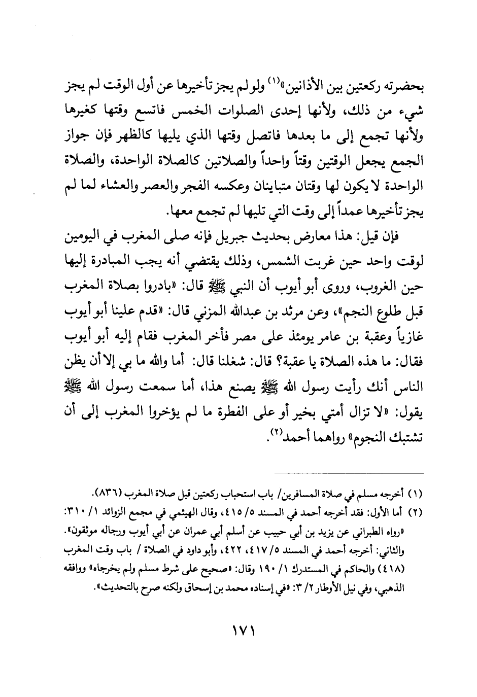 فإن قيل هذا معارض بحديث جبريل فإنه صلى المغرب في اليومين لوقت واحد حين غربت الشمس وذلك يقتضي أنه يجب المبادرة إليها حين الغروب وروى أبو أيوب أن النبي صلى الله عليه وسلم قال: "بادروا بصلاة المغرب قبل طلوع النجم" وعن مرثد بن عبد الله الزني قال: قدم علينا أبو أيوب غازيا وعقبة بن عامر يومئذ على مصر فأخر المغرب فقام إليه أبو أيوب فقال: ما هذه الصلاة يا عقبة قال شغلنا قال: أما والله ما بي إلا أن يظن الناس أنك رأيت رسول الله صلى الله عليه وسلم يصنع هذا أما سمعت رسول الله صلى الله عليه وسلم يقول: "لا تزال أمتي بخير أو على الفطرة ما لم يؤخروا المغرب إلى أن تشتبك النجوم" رواهما احمد.