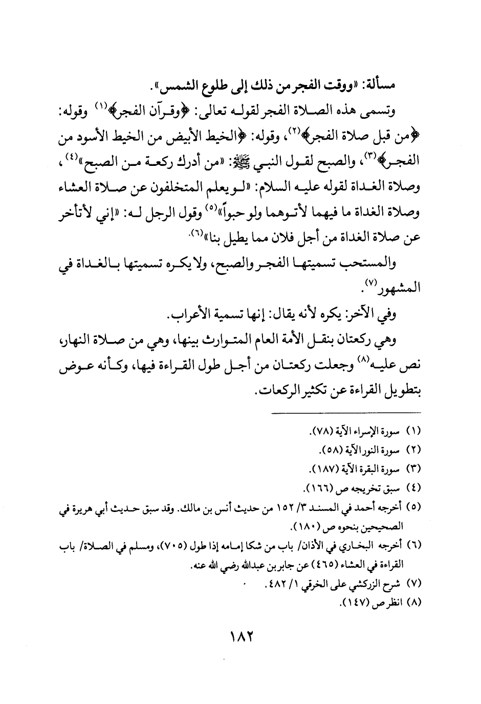وصلاة الغداة لقوله عليه السلام: "لو يعلم المتخلفون عن صلاة العشاء وصلاة الغداة ما فيهما لأتوهما ولو حبوا" وقال الرجل له إني لأتأخر عن صلاة الغداة من أجل فلان مما يطيل بنا.