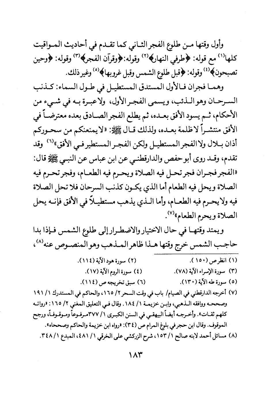 وهما فجران فالأول المستدق المستطيل في طول السماء كذنب السرحان وهو الذئب ويسمى الفجر الأول ولا عبرة به في شيء من الأحكام ثم يسود الأفق بعده ثم يطلع الفجر الصادق بعده معترضا في الأفق منتشرا لا ظلمة بعده ولذلك قال صلى الله عليه وسلم: "لا يمنعنكم من سحوركم آذان بلال ولا الفجر المستطيل ولكن الفجر المستطير في الأفق" وقد تقدم وقد روى أبو حفص والدارقطني عن ابن عباس عن النبي صلى الله عليه وسلم قال: "الفجر فجران فجر تحل فيه الصلاة ويحرم فيه الطعام وفجر تحرم فيه الصلاة ويحل فيه الطعام" أما الذي يكون كذنب السرحان فلا تحل الصلاة فيه ولا يحرم فيه الطعام وأما الذي يذهب مستطيلا في الأفق فإنه يحل الصلاة ويحرم الطعام.