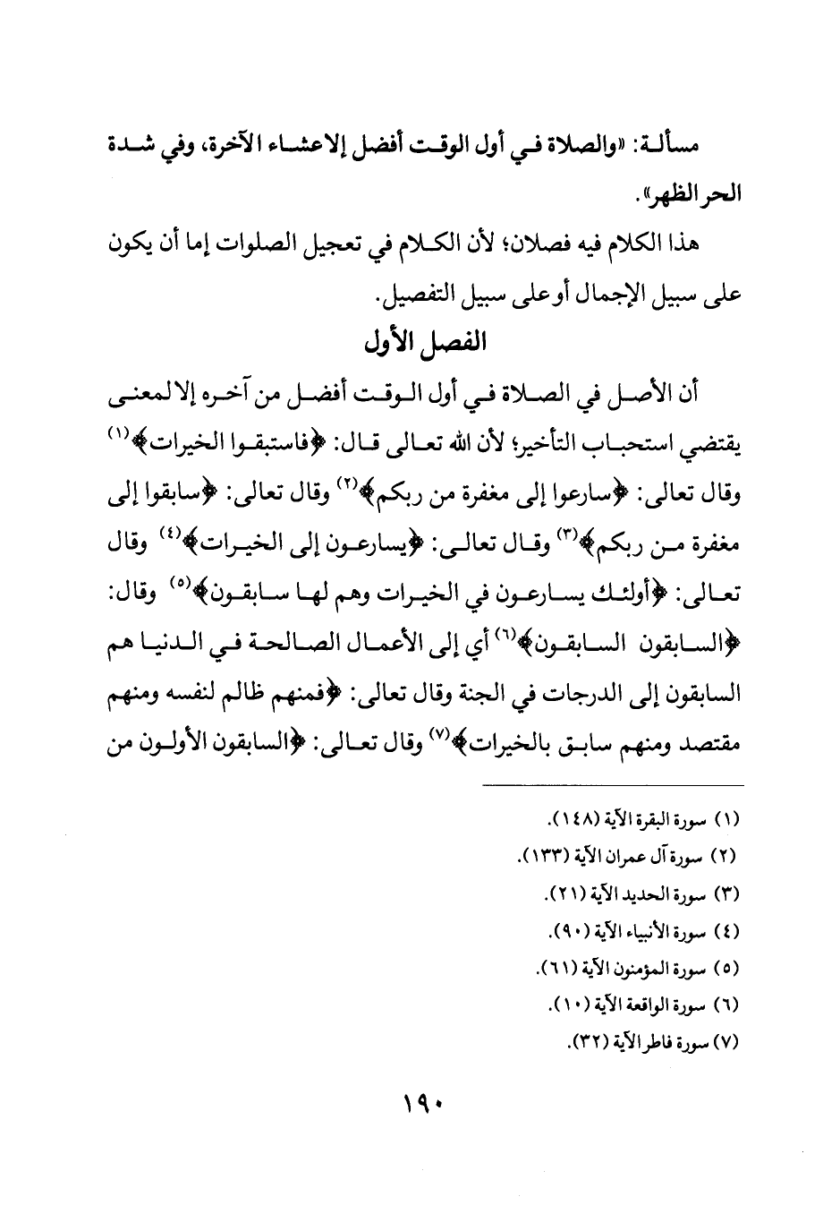 إن الأصل في الصلاة في أول الوقت أفضل من آخره إلا لمعنى يقتضي استحباب التأخير لأن الله تعالى قال: {فَاسْتَبِقُوا الْخَيْرَاتِ} وقال تعالى: {وَسَارِعُوا إلى مَغْفِرَةٍ مِنْ رَبِّكُمْ} وقال تعالى: {سَابِقُوا إلى مَغْفِرَةٍ مِنْ رَبِّكُمْ} وقال تعالى: {أولئك يُسَارِعُونَ فِي الْخَيْرَاتِ وَهُمْ لَهَا سَابِقُونَ} وقال: {وَالسَّابِقُونَ السَّابِقُونَ} أي إلى الأعمال الصالحة في الدنيا هم السابقون إلى الدرجات في الجنة وقال تعالى: {فَمِنْهُمْ ظَالِمٌ لِنَفْسِهِ وَمِنْهُمْ مُقْتَصِدٌ وَمِنْهُمْ سَابِقٌ بِالْخَيْرَاتِ} وقال تعالى: {وَالسَّابِقُونَ الأَوَّلُونَ مِنَ