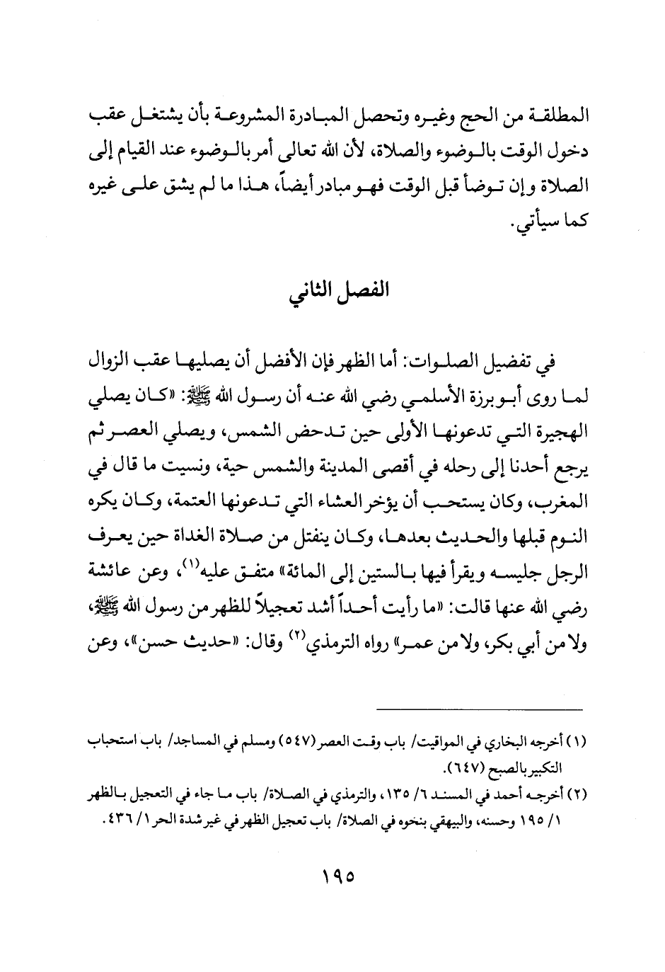 في تفضيل الصلوات أما الظهر فإن الأفضل أن يصليها عقب الزوال لما روى أبو برزة الاسلمي رضي الله عنه أن رسول الله صلى الله عليه وسلم: "كان يصلي الهجيرة التي تدعونها الأولى حين تدحض الشمس ويصلي العصر ثم يرجع أحدنا إلى رحله في أقصى المدينة والشمس حية ونسيت ما قال في المغرب وكان يستحب أن يؤخر العشاء التي تدعونها العتمة وكان يكره النوم قبلها والحديث بعدها وكان ينتفل من صلاة الغداة حين يعرف الرجل جليسه ويقرا فيها بالستين إلى المائة" متفق عليه وعن عائشة رضي الله عنها قالت: "ما رأيت أحدا أشد تعجيلا للظهر من رسول الله صلى الله عليه وسلم ولا من أبي بكر ولا من عمر" رواه الترمذي وقال حديث حسن وعن