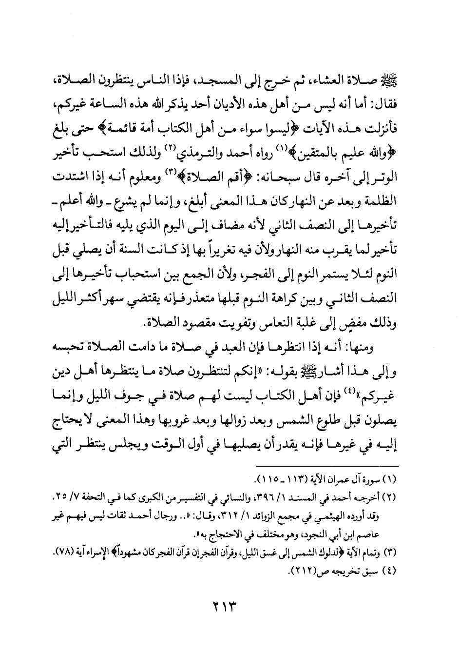 صلى الله عليه وسلم صلاة العشاء ثم خرج إلى المسجد فإذا الناس ينتظرون الصلاة فقال أما أنه ليس من أهل هذه الأديان أحد يذكر الله هذه الساعة غيركم فأنزلت هذه الآية: {لَيْسُوا سَوَاءً مِنْ أهل الْكِتَابِ أُمَّةٌ قَائِمَةٌ} حتى بلغ {وَاللَّهُ عَلِيمٌ بِالْمُتَّقِينَ} " رواه أحمد والترمذي ولذلك استحب تأخير الوتر إلى آخره قال سبحانه: {أَقِمِ الصَّلاةَ} ومعلوم أنه إذا اشتدت الظلمة وبعد عن النهار كان هذا المعنى ابلغ وإنما لم يشرع والله أعلم تأخيرها إلى النصف الثاني لأنه مضاف إلى اليوم الذي يليه فالتأخير إليه تأخير لما يقرب منه النهار ولأن فيه تغريرا بها إذ كانت السنة أن يصلي قبل النوم لئلا يستمر النوم إلى الفجر ولان الجمع بين استحباب تأخيرها إلى النصف الثاني وبين كراهة النوم قبلها متعذر فإنه يقتضي سهر أكثر الليل وذلك مفض إلى غلبة النعاس وتفويت مقصود الصلاة.