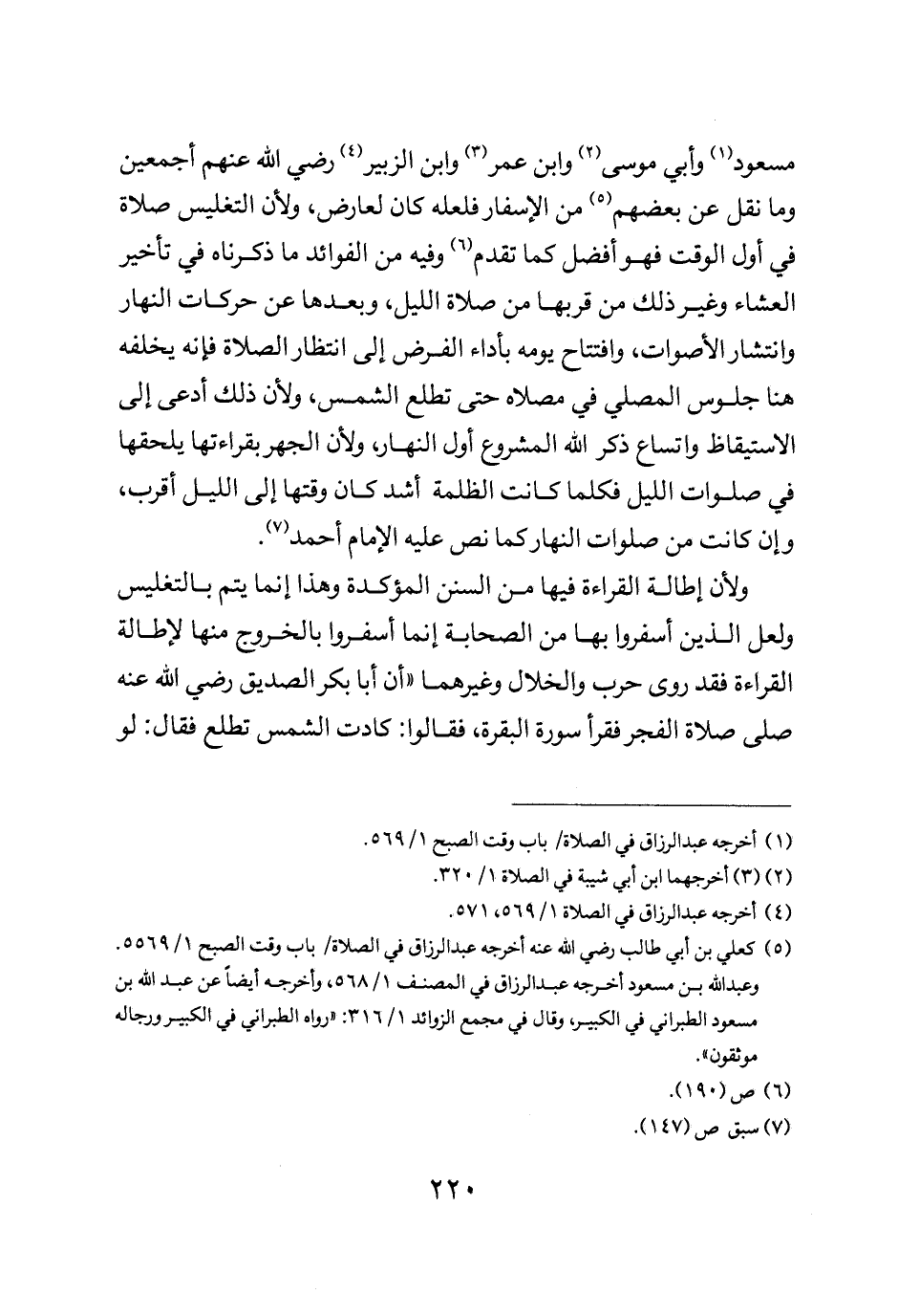 ولأن إطالة القراءة فيها من السنن المؤكدة وهذا إنما يتم بالتغليس ولعل الذين اسفروا بها من الصحابة إنما اسفروا بالخروج منها لإطالة القراءة فقد روى حرب والخلال وغيرهما أن أبا بكر الصديق رضي الله عنه صلى صلاة الفجر فقرأ سورة البقرة فقالوا كادت الشمس تطلع فقال: لو