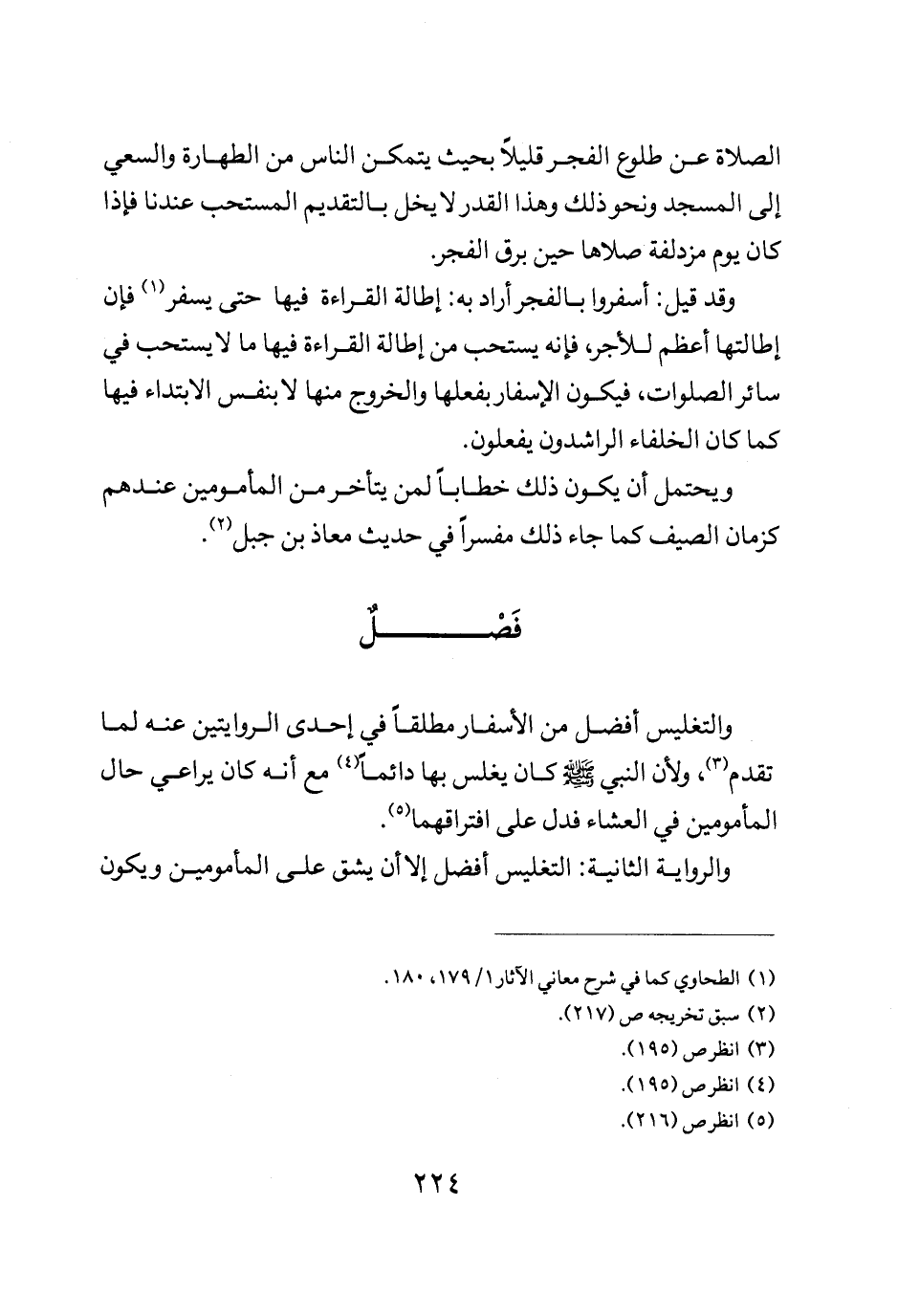 وقد قيل اسفروا بالفجر أراد به إطالة القراءة فيها حتى يسفر الفجر فإن إطالتها أعظم للأجر فإنه يستحب من إطالة القراءة فيها ما لا يستحب في سائر الصلوات فيكون الأسفار بفعلها والخروج منها لا بنفس الابتداء فيها كما كان الخلفاء الراشدون يفعلون.