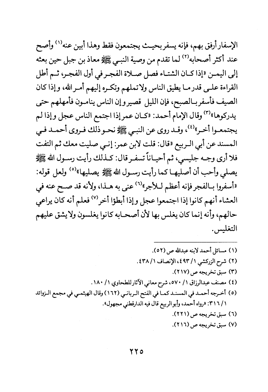الأسفار ارفق بهم فإنه يسفر بحيث يجتمعون فقط وهذا أبين عنه واصح عند أكثر أصحابه لما تقدم من وصية النبي صلى الله عليه وسلم معاذ بن جبل حين بعثه إلى اليمن " إذا كان الشتاء فصل صلاة الفجر في أول الفجر ثم اطل القراءة على قدر ما يطيق الناس ولا تملهم وتكره إليهم أمر الله وإذا كان الصيف فأسفر بالصبح فإن الليل قصير وأن الناس ينامون فأمهلهم حتى يدركوها" وقال الإمام أحمد كان عمر إذا اجتمع الناس عجل وإذا لم يجتمعوا آخر وقد روى عن النبي صلى الله عليه وسلم نحو ذلك فروى أحمد في المسند عن أبي الربيع قال قلت لابن عمر إني صليت معك ثم التفت فلا أرى وجه جليسي ثم أحيانا تسفر قال كذلك رأيت رسول الله صلى الله عليه وسلم يصلي واحب أن اصليها كما رأيت رسول الله صلى الله عليه وسلم يصليها ولعل قوله: "اسفروا بالفجر فإنه أعظم للأجر" عنى به هذا ولأنه قد صح عنه في العشاء أنهم كانوا إذا اجتمعوا عجل وإذا ابطؤا آخر فعلم أنه كان يراعي حالهم وأنه إنما كان يغلس بها لأن أصحابه كانوا يغسلون ولا يشق عليهم التغليس.