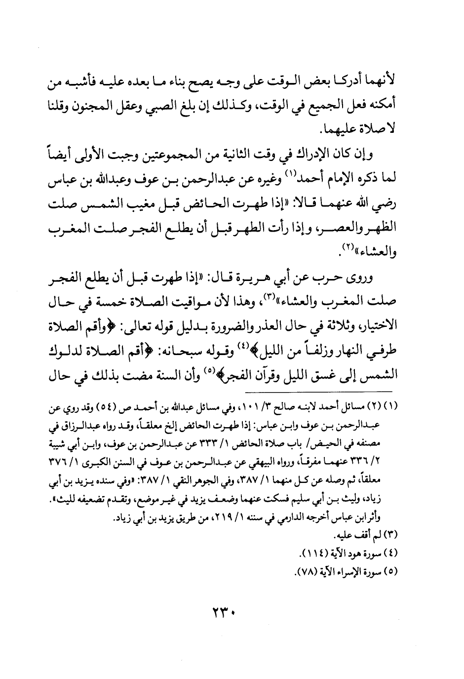 وإن كان الإدراك في وقت الثانية من المجموعتين وجبت الأولى أيضا لما ذكره الإمام أحمد وغيره عن عبد الرحمن بن عوف وعبد الله بن عباس رضي الله عنهما قالا إذا طهرت الحائض قبل مغيب الشمس صلت الظهر والعصر وإذا رأت الطهر قبل أن يطلع الفجر صلت المغرب والعشاء.