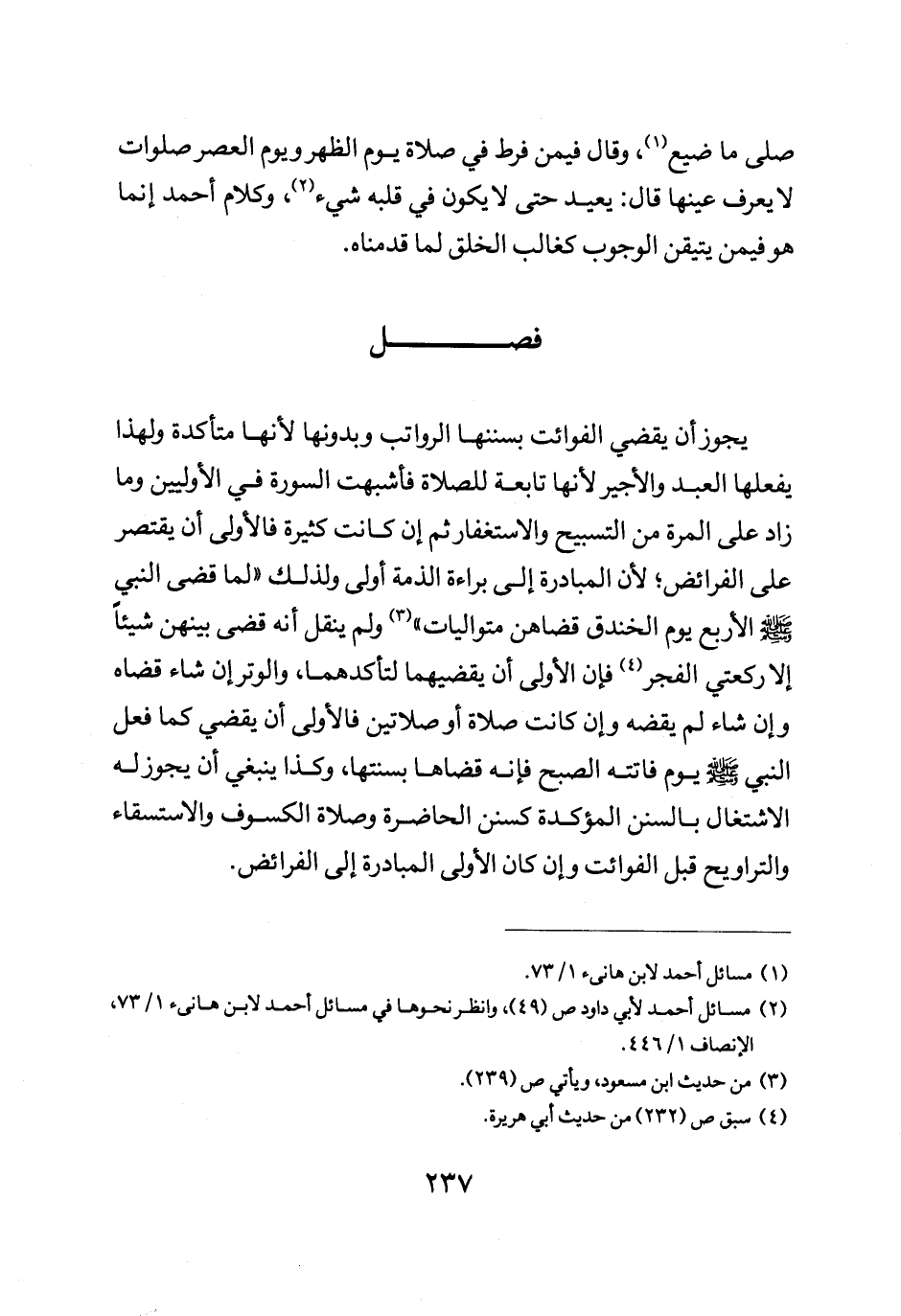 يجوز أن يقضي الفوائت بسننها الرواتب وبدونها لأنها متأكدة ولهذا يفعلها العبد والأجير لأنها تابعة للصلاة فأشبهت السورة في الأوليين وما زاد على المرة من التسبيح والاستغفار ثم أن كانت كثيرة فالأولى أن يقتصر على الفرائض لأن المبادرة إلى براءة الذمة أولى ولذلك لما قضى النبي صلى الله عليه وسلم الأربع يوم الخندق قضاهن متواليات ولم ينقل أنه قضى بينهن شيئا إلا ركعتي الفجر فإن الأولى أن يقضيهما لتأكدهما والوتر أن شاء قضاه وأن شاء لم يقضه وأن كانت الصلاة أو صلاتين فالأولى أن يقضي كما فعل النبي صلى الله عليه وسلم يوم فاتته الصبح فإنه قضاها بسنتها وكذا ينبغي أن يجوز له الاشتغال بالسنن المؤكدة كسننن الحاضرة وصلاة الكسوف والاستسقاء والتراويح قبل الفوائت وأن كان الأولى المبادرة إلى الفرائض.