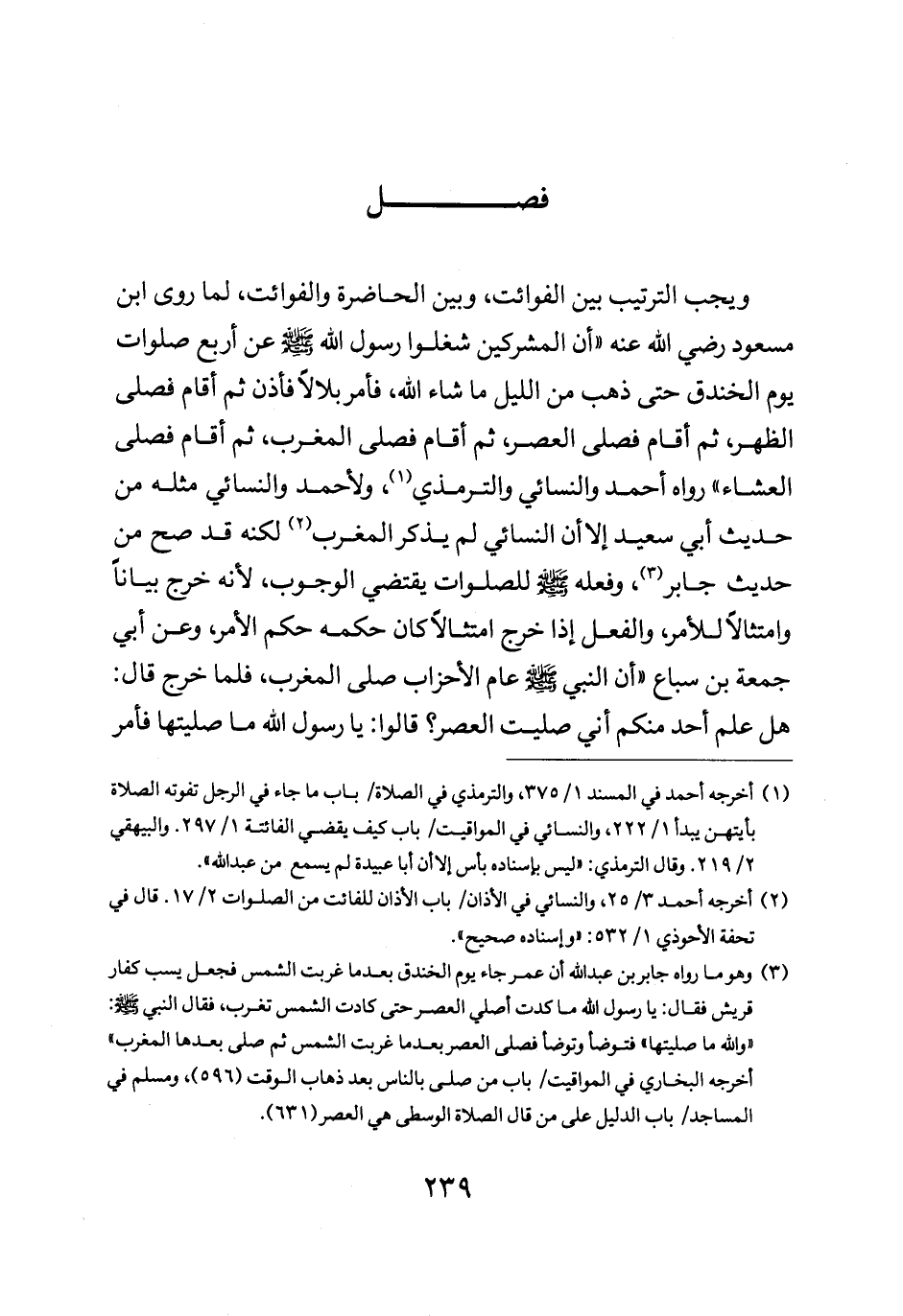 ويجب الترتيب بين الفوائت وبين الحاضرة والفوائت لما روى ابن مسعود رضي الله عنه: "إن المشركين شغلوا رسول الله صلى الله عليه وسلم عن أربع صلوات يوم الخندق حتى ذهب من الليل ما شاء الله فأمر بلالا فأذن ثم أقام فصلى الظهر ثم أقام فصلى العصر ثم أقام فصلى المغرب ثم أقام فصلى العشاء" رواه أحمد والنسائي والترمذي ولأحمد والنسائي مثله من حديث أبي سعيد إلا أن النسائي لم يذكر المغرب لكنه قد صح من حديث جابر: "وفعله صلى الله عليه وسلم للصلوات يقتضي الوجوب لأنه خرج بيانا وامتثالا للأمر والفعل إذا خرج امتثالا كان حكمه حكم الأمر وعن أبي جمعة بن سباع: "أن النبي صلى الله عليه وسلم عام الأحزاب صلى المغرب فلما خرج قال هل علم أحد منكم إني صليت العصر قالوا يا رسول الله ما صليتها فأمر