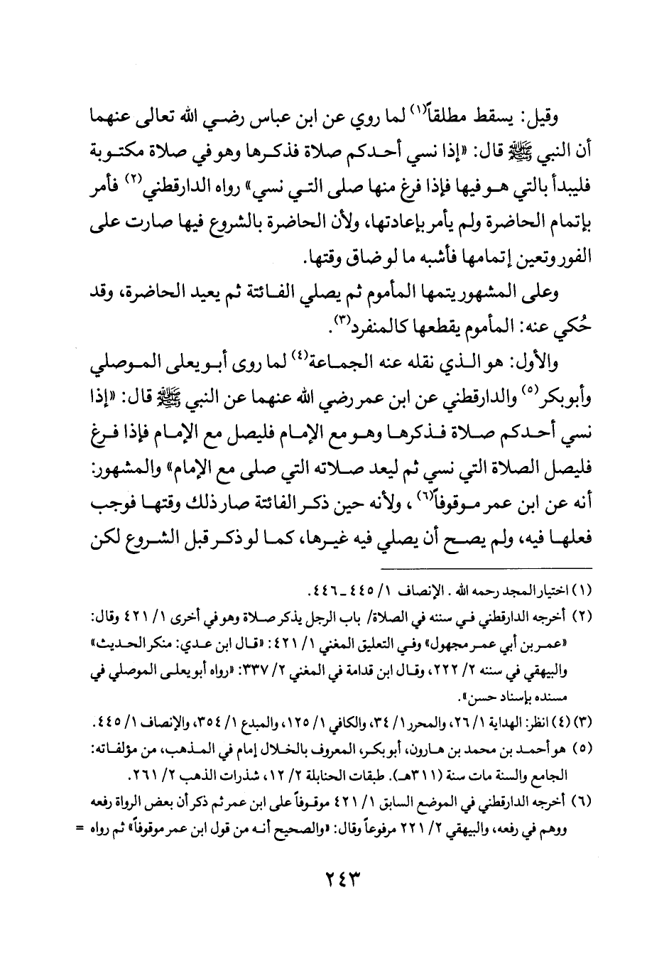 والأول هو الذي نقله عنه الجماعة لما روى أبو يعلى الموصلي وأبو بكر والدارقطني عن ابن عمر رضي الله عنهما عن النبي صلى الله عليه وسلم قال: "إذا نسي أحدكم صلاة فذكرها وهو مع الإمام فليصل مع الإمام فإذا فرغ فليصل الصلاة التي نسي ثم ليعد صلاته التي صلى مع الإمام" والمشهور أنه عن ابن عمر موقوفا ولأنه حين ذكر الفائتة صار ذلك وقتها فوجب فعلها فيه ولم يصح أ , يصلي فيه غيرها كما لو ذكر قبل الشروع لكن