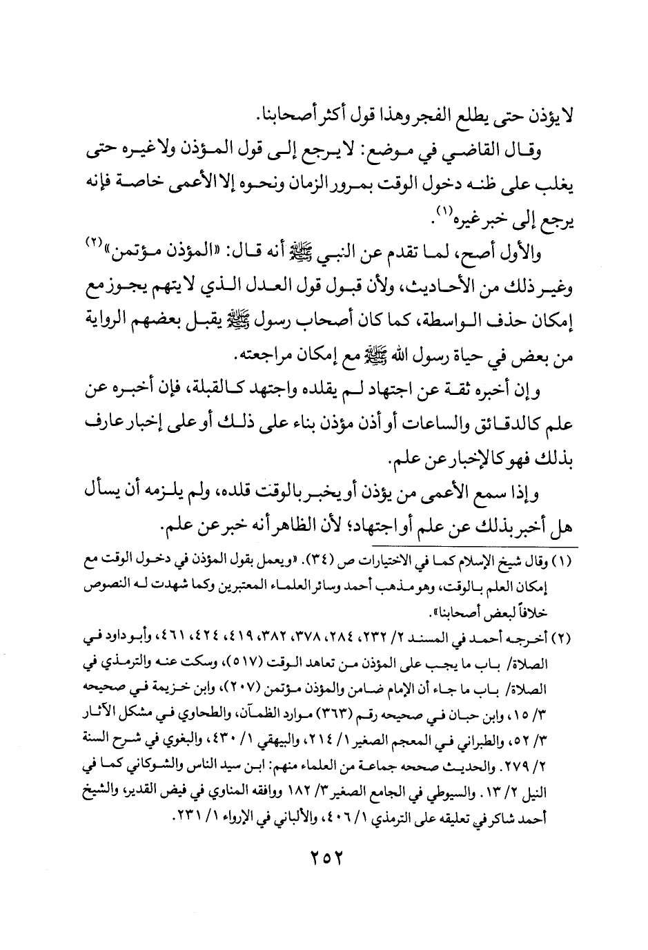 والأول أصح لما تقدم عن النبي صلى الله عليه وسلم أنه قال: "المؤذن مؤتمن" وغير ذلك من الأحاديث ولأن قبول قول العدل الذي لا يتهم يجوز مع إمكان حذف الواسطة كما كان أصحاب رسول الله صلى الله عليه وسلم يقبل بعضهم الرواية من بعض في حياة رسول الله صلى الله عليه وسلم مع إمكان مراجعته.