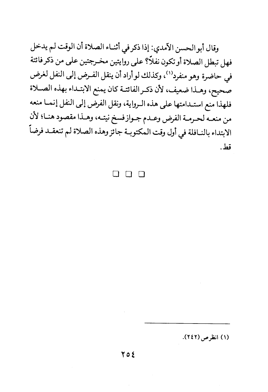 وقال أبو الحسن الآمدي إذا ذكر في أثناء الصلاة أن الوقت لم يدخل فهل تبطل الصلاة أو تكون نفلا على روايتين مخرجتين على من ذكر فائتة في حاضرة وهو منفرد وكذلك لو أراد أن ينقل الفرض إلى النفل لغرض صحيح وهذا ضعيف لأن ذكر الفائتة كان يمنع الابتداء بهذه الصلاة فلهذا منع استدامتها على هذه الرواية ونقل الفرض إلى النفل إنما منعه من منعه لحرمة الفرض وعدم جواز فسخ نيته وهذا مقصود هنا لأن الابتداء بالنافلة في أول وقت المكتوبة جائز وهذه الصلاة لم تنعقد فرضا قط.