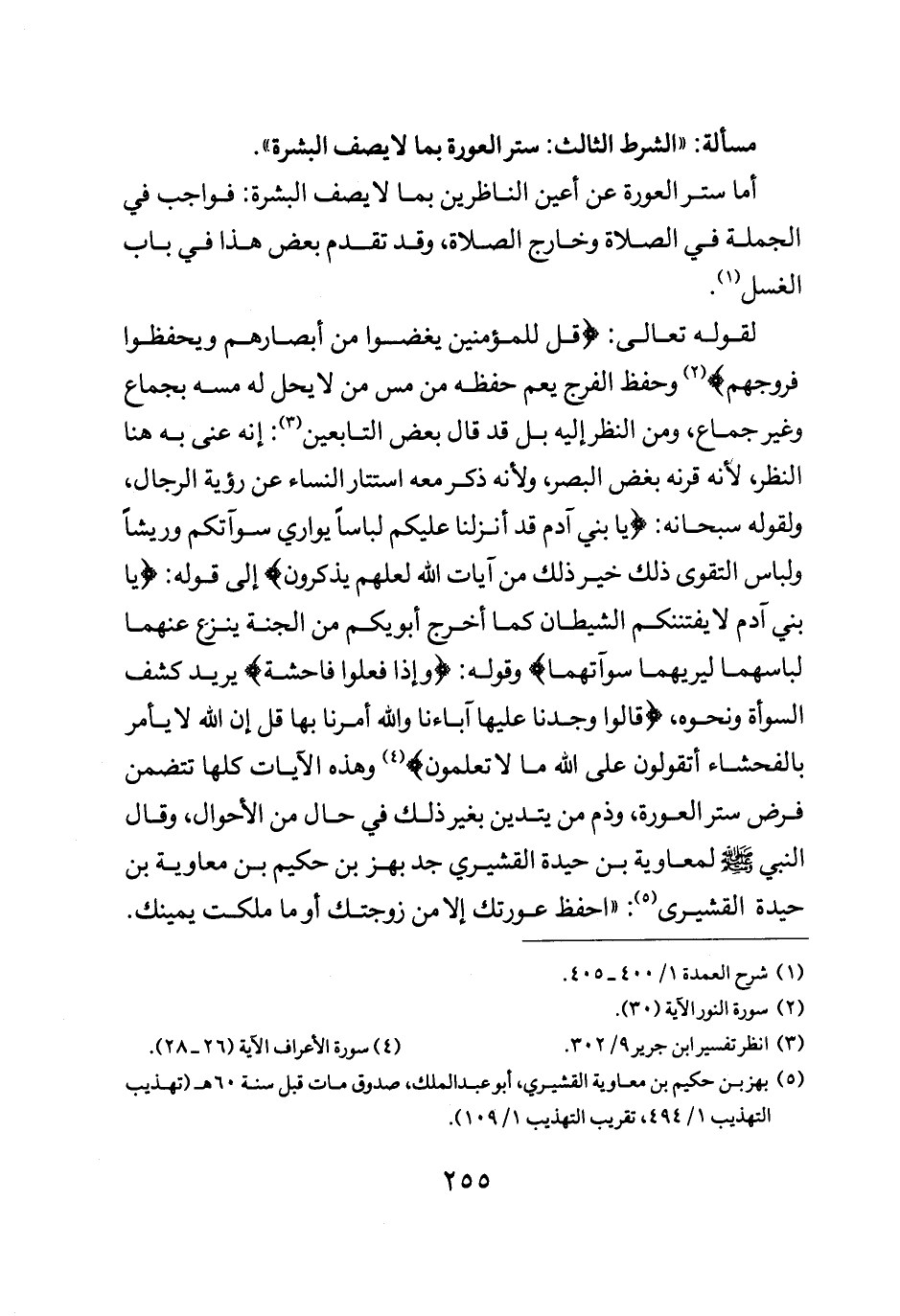 لقوله تعالى: {قُلْ لِلْمُؤْمِنِينَ يَغُضُّوا مِنْ أَبْصَارِهِمْ وَيَحْفَظُوا فُرُوجَهُمْ} وحفظ الفرج يعم حفظة من مس من لا يحل له مسه بجماع وغير جماع ومن النظر إليه بل قد قال بعض التابعين أنه عنى به هنا النظر لأنه قرنه بغض البصر ولأنه ذكر معه استتار النساء عن رؤية الرجال ولقوله سبحانه: {يَا بَنِي آدَمَ قَدْ أَنْزَلْنَا عَلَيْكُمْ لِبَاساً يُوَارِي سَوْآتِكُمْ وَرِيشاً وَلِبَاسُ التَّقْوَى ذَلِكَ خَيْرٌ ذَلِكَ مِنْ آيَاتِ اللَّهِ لَعَلَّهُمْ يَذَّكَّرُونَ} إلى قوله: {يا بني آدم لا يفتننكم الشيطان كما اخرج أبويكم من الجنة ينزع عنهما لباسهما ليريهما سوآتهما} وقوله: {وَإِذَا فَعَلُوا فَاحِشَةً} يريد كشف السوءة ونحوه {قَالُوا وَجَدْنَا عَلَيْهَا آبَاءَنَا وَاللَّهُ أمرنا بِهَا قُلْ أن اللَّهَ لا يَأْمُرُ بِالْفَحْشَاءِ أَتَقُولُونَ عَلَى اللَّهِ مَا لا تَعْلَمُونَ} وهذه الآيات كلها تتضمن فرض ستر العورة وذم من يتدين بغير ذلك في حال من الأحوال وقال النبي صلى الله عليه وسلم لمعاوية بن حيدة القشيري جد بهز بن حكيم بن معاوية بن حيدة القشيري: "احفظ عورتك إلا من زوجتك أو ما ملكت يمينك".