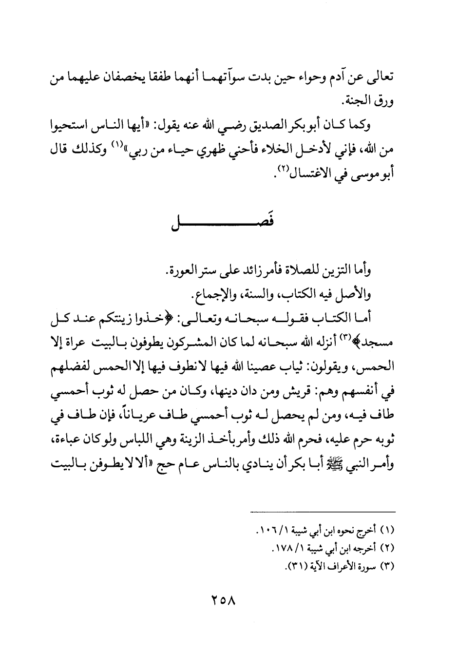 أما الكتاب فقوله سبحانه وتعالى: {خُذُوا زِينَتَكُمْ عِنْدَ كُلِّ مَسْجِدٍ} أنزله الله سبحانه لما كان المشركون يطوفون بالبيت عراة إلا الحمس ويقولون ثياب عصينا الله فيها لا نطوف فيها إلا الحمس لفضلهم في أنفسهم وهم قريش ومن دان دينها وكان من حصل له ثوب احمسي طاف فيه ومن لم يحصل له ثوب احمسي طاف عريانا فإن طاف في ثوبه حرم عليه فحرم الله ذلك وأمر بأخذ الزينة وهي اللباس ولو كان عباءة وأمر النبي صلى الله عليه وسلم أبا بكر أن ينادي بالناس عام حج: "ألا لا يطوفن بالبيت