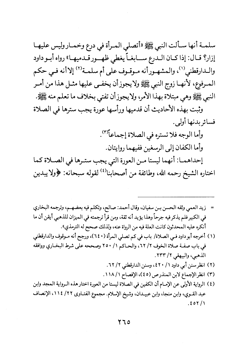 سلمة: "أنها سألت النبي صلى الله عليه وسلم اتصلي المرأة في درع وخمار وليس عليها إزار قال: "إذا كان الدرع سابغا يغطي ظهور قدميها" رواه أبو داود والدارقطني والمشهور أنه موقوف على أم سلمة إلا أنه في حكم المرفوع لأنها زوج النبي صلى الله عليه وسلم ولا يجوز أن يخفى عليها مثل هذا من أمر النبي صلى الله عليه وسلم وهي مبتلاة بهذا الأمر ولا يجوز أن تفتي بخلاف ما تعلم منه صلى الله عليه وسلم.