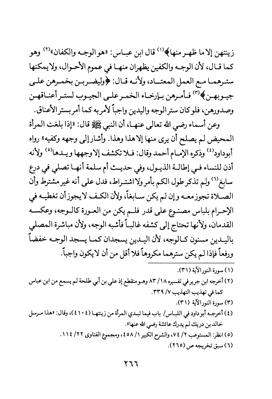 زِينَتَهُنَّ إلا مَا ظَهَرَ مِنْهَا} قال ابن عباس هو الوجه والكفان وهو كما قال لأن الوجه والكفين يظهران منها في عموم الأحوال ولا يمكنها سترهما مع العمل المعتاد ولأنه قال: {وَلْيَضْرِبْنَ بِخُمُرِهِنَّ عَلَى جُيُوبِهِنَّ} فأمرهن بإرخاء الخمر على الجيوب لستر أعناقهن وصدورهن فلو كان ستر الوجه واليدين واجبا لأمر كما أمر بستر الأعناق.