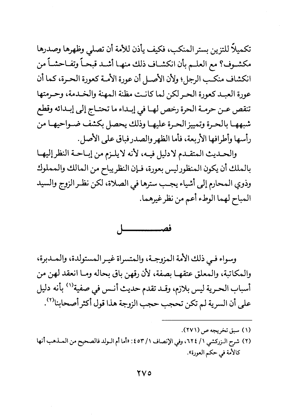 تكميلا للتزين بستر المنكب فكيف يأذن للامة أن تصلي وظهرها وصدرها مكشوف مع العلم بان انكشاف ذلك منها أشد قبحا وتفاحشا من انكشاف منكب الرجل ولأن الأصل أن عورة الأمة كعورة الحرة كما أن عورة العبد كعورة الحر لكن لما كانت مظنة المهنة والخدمة وحرمتها تنقص عن حرمة الحرة رخص لها في إبداء ما تحتاج إلى إبدائه وقطع شبهها بالحرة وتمييز الحرة عليها وذلك يحصل بكشف ضواحيها من رأسها وأطرافها الأربعة فأما الظهر والصدر فباق على الأصل.