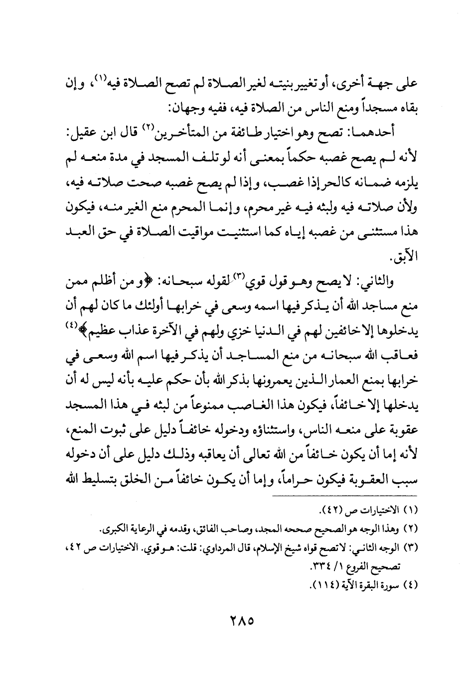 والثاني: لا يصح وهو قول قوي لقوله سبحانه: {وَمَنْ أَظْلَمُ مِمَّنْ مَنَعَ مَسَاجِدَ اللَّهِ أن يُذْكَرَ فِيهَا اسْمُهُ وَسَعَى فِي خَرَابِهَا أولئك مَا كَانَ لَهُمْ أن يَدْخُلُوهَا إلا خَائِفِينَ لَهُمْ فِي الدُّنْيَا خِزْيٌ وَلَهُمْ فِي الآخِرَةِ عَذَابٌ عَظِيمٌ} فعاقب الله سبحانه من منع المساجد أن يذكر فيها اسم الله وسعى في خرابها بمنع العمار الذين يعمرونها بذكر الله بان حكم عليه بأنه ليس له أن يدخلها إلا خائفا فيكون هذا الغاصب ممنوعا من لبثه في هذا المسجد عقوبة على منعه الناس واستثناؤه ودخوله خائفا دليل على ثبوت المنع لأنه أما أن يكون خائفا من الله تعالى أن يعاقبه وذلك دليل على أن دخوله سبب العقوبة فيكون حراما وأما أن يكون خائفا من الخلق بتسليط الله