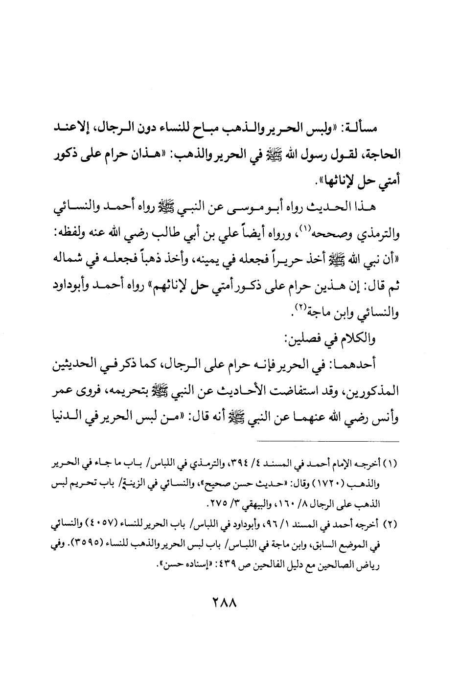 مسألة: (ولبس الحرير والذهب مباح للنساء دون الرجال إلا عند الحاجة لقول رسول الله صلى الله عليه وسلم في الحرير والذهب: "هذان حرام على ذكور أمتي حل لإناثها").