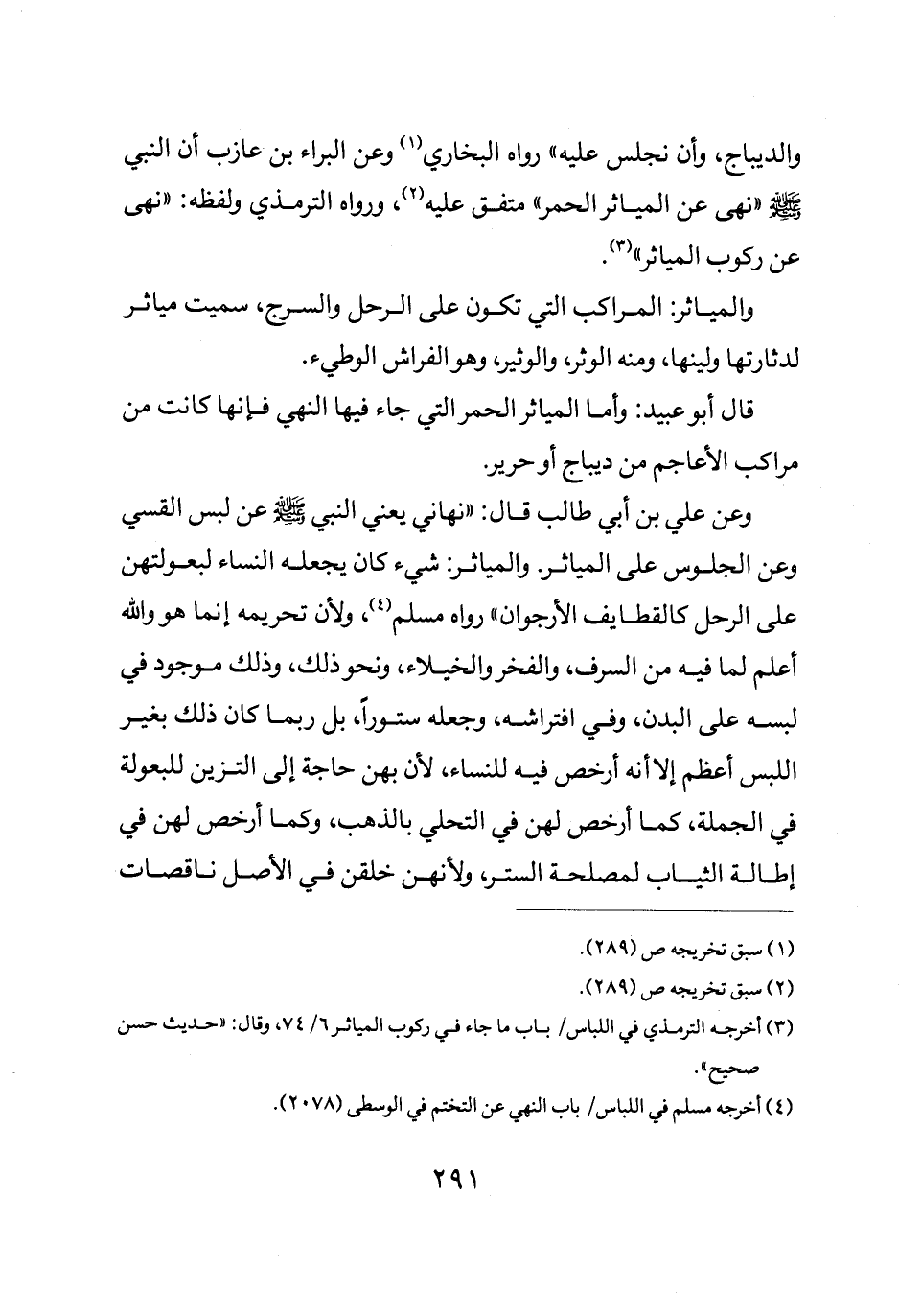 والديباج وأن نجلس عليه" رواه البخاري وعن البراء بن عازب أن النبي صلى الله عليه وسلم: "نهى عن المياثر الحمر" متفق عليه ورواه الترمذيولفظه: "نهى عن ركوب المياثر.
