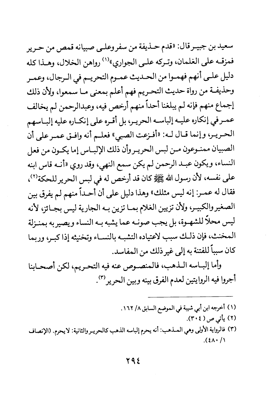 سعيد بن جبير قال: "قدم حذيفة من سفر وعلى صبيانه قمص من حرير فمزقه على الغلمان وتركه على الجواري" رواهن الخلال وهذا كله دليل على أنهم فهموا من الحديث عموم التحريم في الرجال وعمر وحذيفة من رواة حديث التحريم فهم أعلم بمعنى ما سمعوا ولأن ذلك إجماع منهم فإنه لم يبلغنا أحدا منهم ارخص فيه وعبد الرحمن لم يخالف عمر في إنكاره عليه إلباسه الحرير بل اقره على إنكاره عليه إلباسهم الحرير وإنما قال له أفزعت الصبي فعلم أنه وافق عمر على أن الصبيان ممنوعون من لبس الحرير وأن ذلك الإلباس أما يكون من فعل النساء ويكون عبد الرحمن لم يكن سمع النهي وقد روي أنه قاس ابنه على نفسه لأن رسول الله صلى الله عليه وسلم كان قد ارخص له في لبس الحرير للحكة فقال له عمر أنه ليس مثلك وهذا دليل على أن أحدا منهم لم يفرق بين الصغير والكبير ولأن تزيين الغلام بما تزين به الجارية ليس بجائز لأنه ليس محلا للشهوة بل يجب صونه عما يشبه به النساء ويصير به بمنزلة المخنث فإن ذلك سبب لاعتياده التشبه بالنساء وتخنيثه إذا كبر وربما كان سببا للفتنة به إلى غير ذلك من المفاسد.