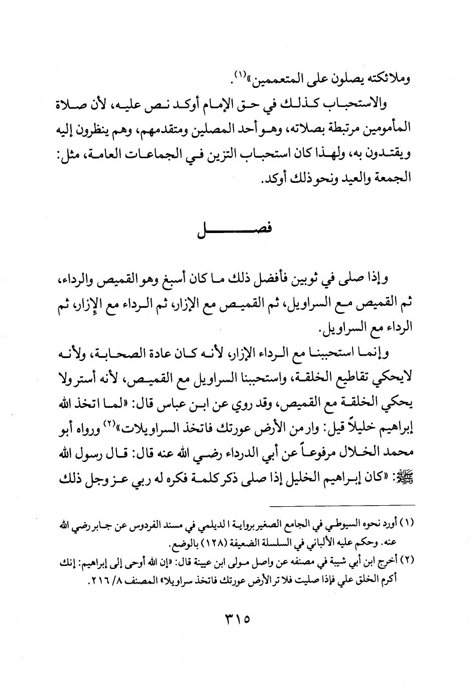 وإنما استحببنا مع الرداء الإزار لأنه كان عادة الصحابة ولأنه لا يحكي تقاطيع الخلقة واستحببنا السراويل مع القميص لأنه استر ولا يحكي الخلقة مع القميص وقد روي عن ابن عباس قال: "لما اتخذ الله إبراهيم خليلا قيل وار من الأرض عورتك فاتخذ السراويلات ورواه أبو محمد الخلال مرفوعا عن أبي الدرداء رضي الله عنه قال قال رسول الله صلى الله عليه وسلم: "كان إبراهيم الخليل إذا صلى ذكر كلمة فكره له ربي عز وجل ذلك