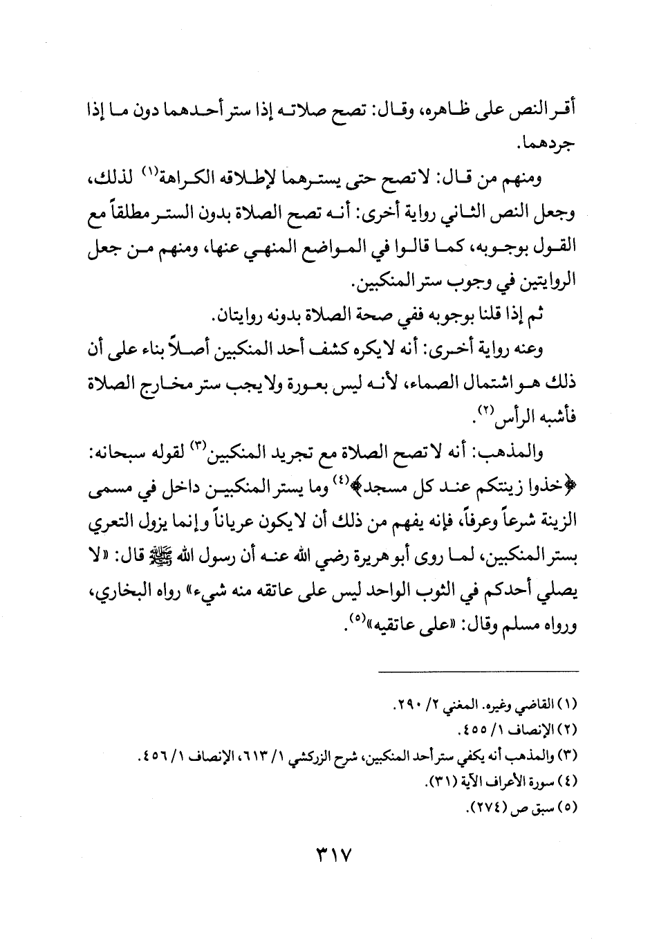 ومنهم من قال لا تصح حتى يسترهما لإطلاقه الكراهة لذلك وجعل النص الثاني رواية أخرى أنه تصح الصلاة بدون الستر مطلقا مع القول بوجوبه كما قالوا في المواضع المنهي عنها ومنهم من جعل الروايتين في وجوب ستر المنكبين.