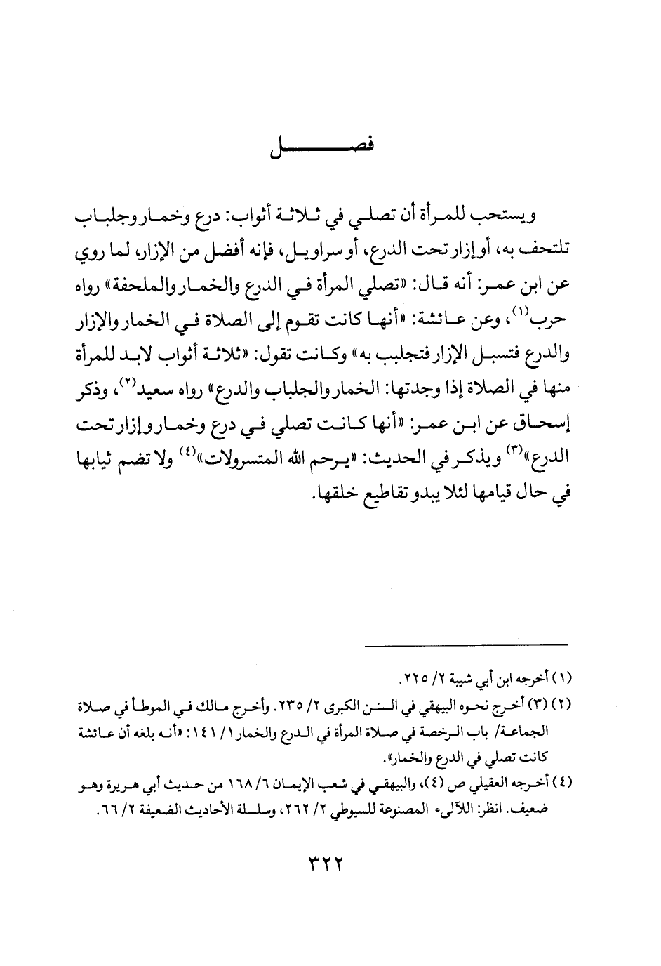 فصل: ويستحب للمرأة أن تصلي في ثلاثة أثواب درع وخمار وجلباب تلتحف به أو إزار تحت الدرع أو سراويل فإنه أفضل من الإزار لما روي عن ابن عمر أنه: "قال تصلي المرأة في الدرع والخمار والملحفة" رواه حرب وعن عائشة أنها كانت تقوم إلى الصلاة في الخمار والإزار والدرع فتسبل الإزار فتجلبب به وكانت تقول: "ثلاثة أثواب لابد للمرأة منها في الصلاة إذا وجدتها الخمار والجلباب والدرع" رواه سعيد وذكر إسحاق عن ابن عمر أنها كانت تصلي في درع وخمار وإزار تحت الدرع ويذكر في الحديث يرحم الله المتسرولات ولا تضم ثيابها في حال قيامها لئلا يبدو تقاطيع خلقها.