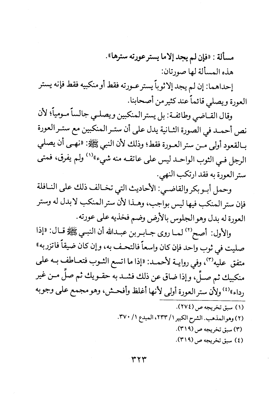 وقال القاضي وطائفة بل يستر المنكبين ويصلي جالسا موميا لأن نص أحمد في الصورة الثانية يدل على أن ستر المنكبين مع ستر العورة بالقعود أولى من ستر العورة فقط وذلك لأن النبي صلى الله عليه وسلم: "نهى أن يصلي الرجل في الثوب الواحد ليس على عاتقه منه شيء" ولم يفرق فمتى ستر العورة به فقد ارتكب النهي.
