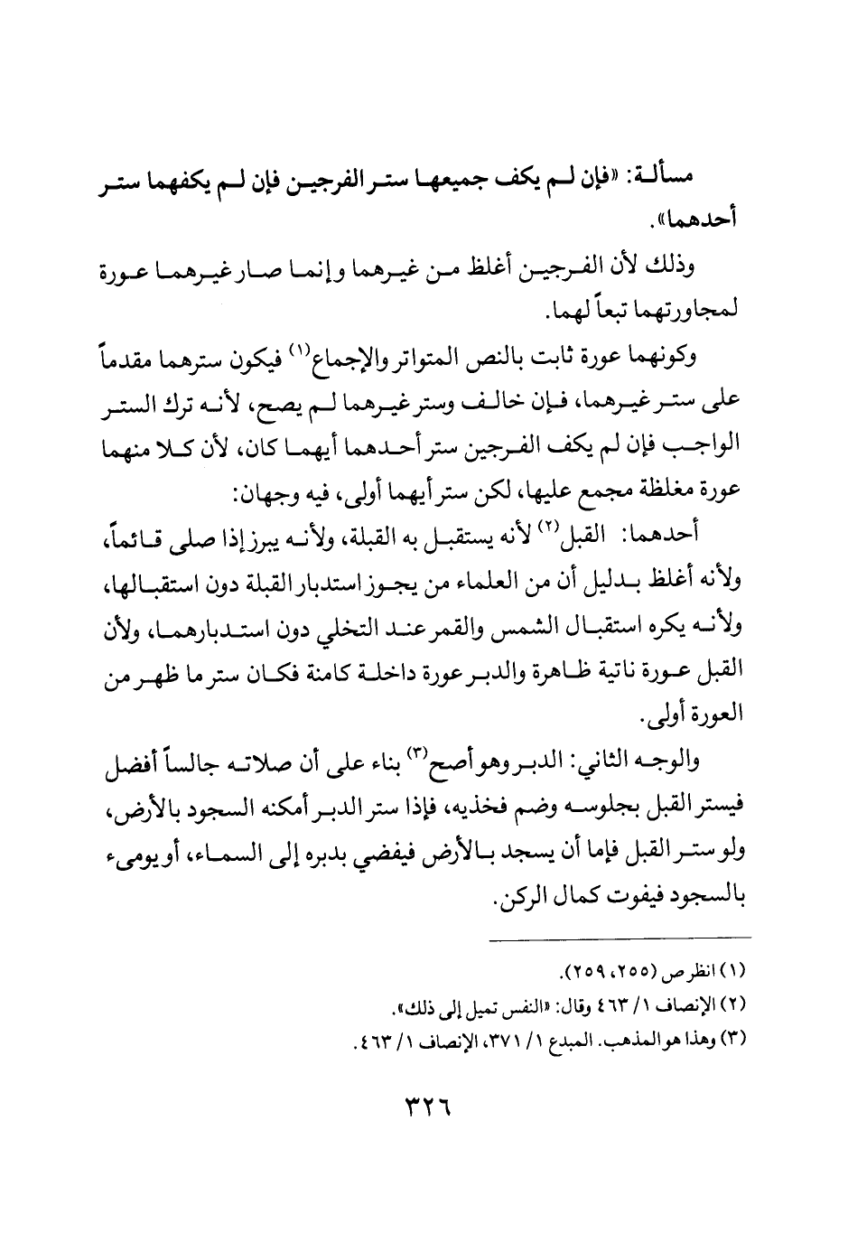 وكونهما عورة ثابت بالنص المتواتر والإجماع فيكون سترهما مقدما على ستر غيرهما فإن خالف وستر غيرهما لم يصح لأنه ترك الستر الواجب فإن لم يكف الفرجين ستر أحدهما: أيهما كان لأن كلاهما عورة مغلظة مجمع عليها لكن ستر أيهما أولى فيه وجهان.