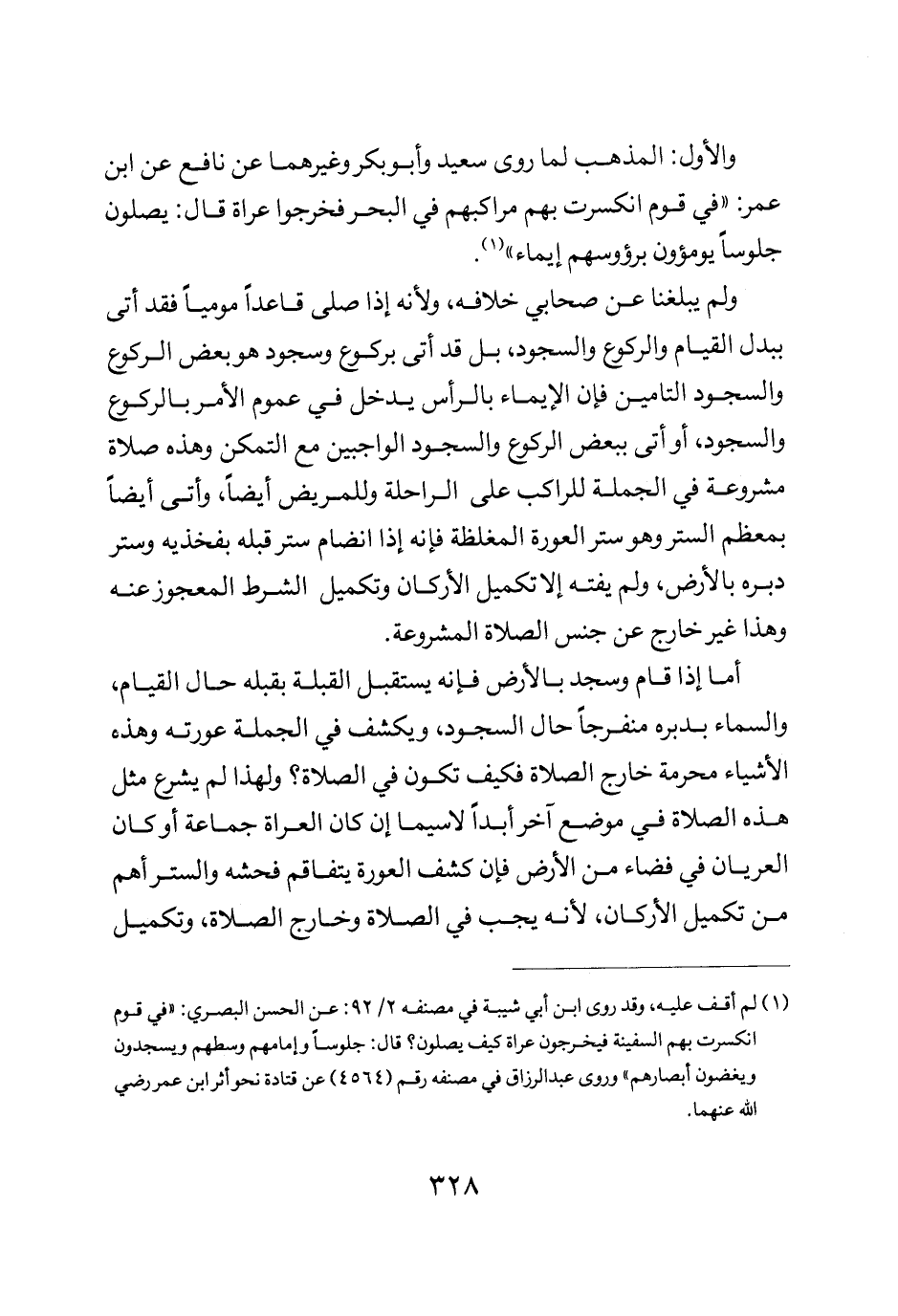 والأول المذهب لما روى سعيد وأبو بكر وغيرهما عن نافع عن ابن عمر في قوم انكسرت بهم مراكبهم في البحر فخرجوا عراة قال يصلون جلوسا يومئون برؤوسهم إيماء.