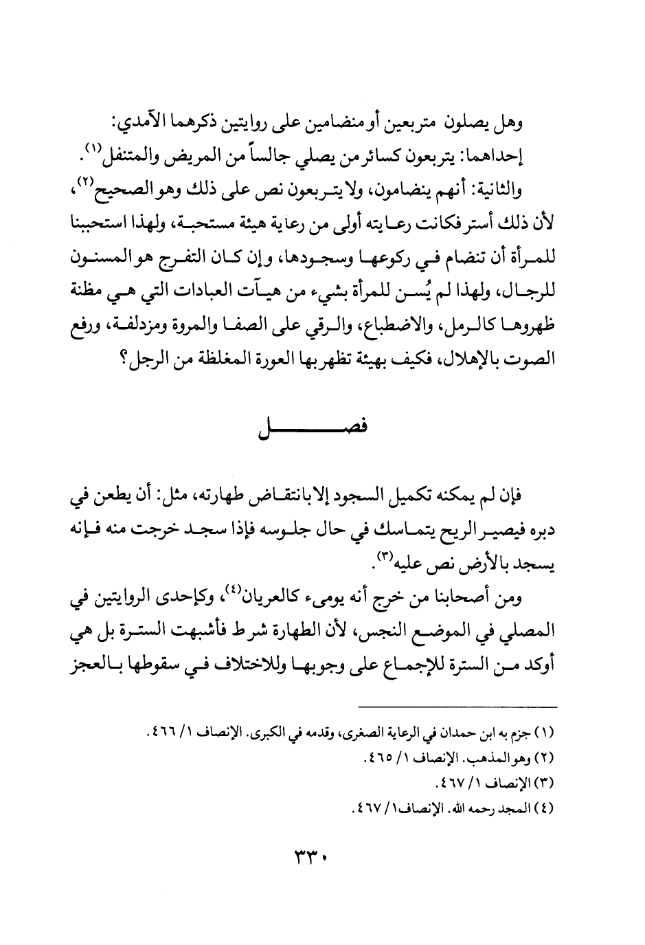 والثانية: أنهم ينضامون ولا يتربعون نص على ذلك وهو الصحيح لأن ذلك استر فكانت رعايته أولى من رعاية هيئة مستحبة ولهذا استحببنا للمرأة أن تنضام في ركوعها وسجودها وأن كان التفرج هو المسنون للرجال ولهذا لم يسن للمرأة بشيء من هيئات العبادات التي هي مظنة ظهورها كالرمل والاضطباع والرقي على الصفا والمروة ومزدلفة ورفع الصوت بالإهلال فكيف بهيئة تظهر بها العورة المغلظة من الرجل.