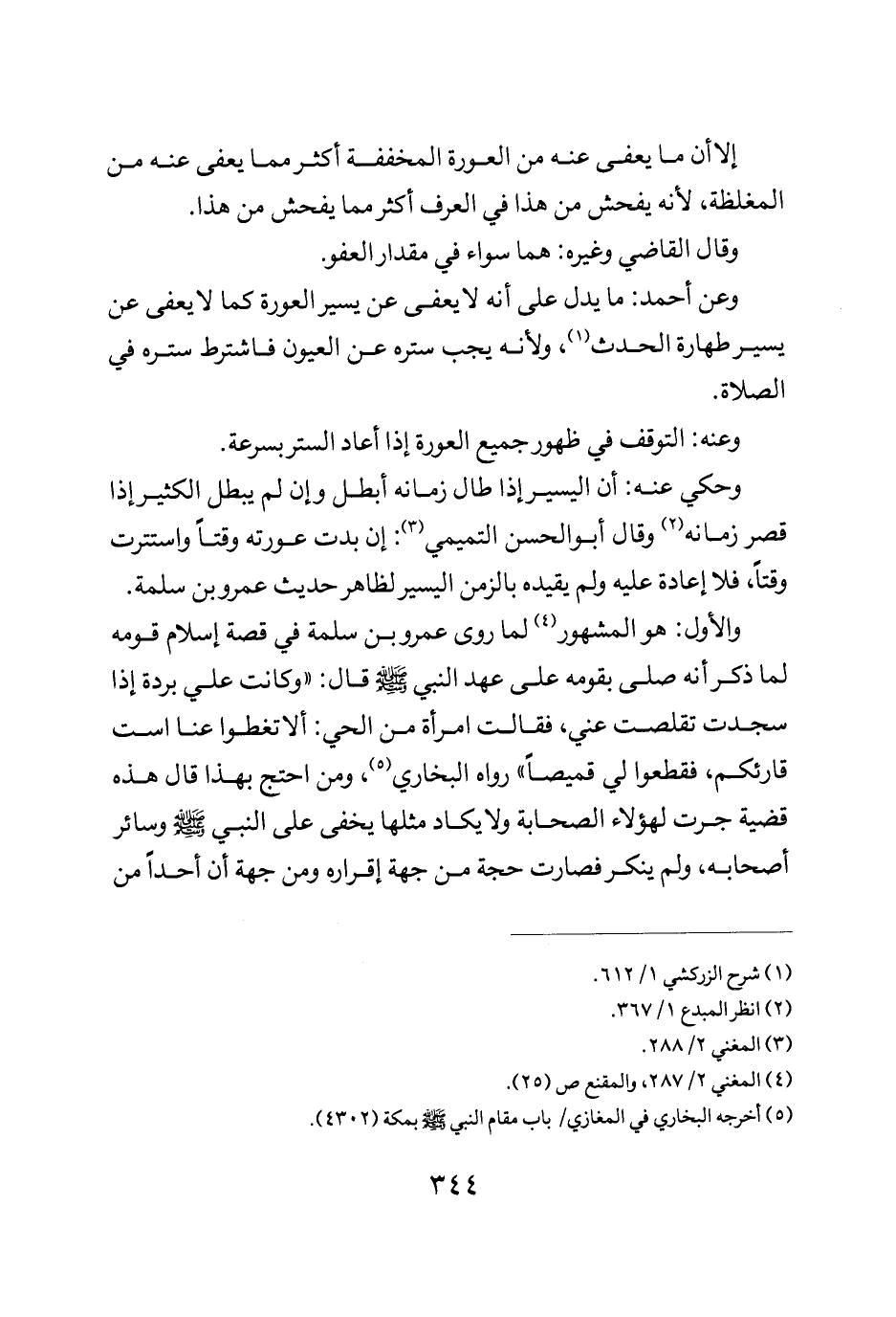 وحكي عنه أن اليسير إذا طال زمانه ابطل وأن لم يبطل الكثير إذا قصر زمانه وقال أبو الحسن التميمي أن بدت عورته وقتا واستترت وقتا فلا إعادة عليه ولم يقيده بالزمن اليسير لظاهر حديث عمرو بن سلمة.