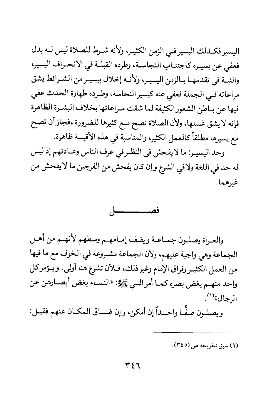 اليسير فكذلك اليسير في الزمن الكثير ولأنه شرط للصلاة ليس له بدل فعفي عن يسيره كاجتناب النجاسة وطرده القبلة في الانحراف اليسير والنية في تقدمها بالزمن اليسير ولأنه إخلال بيسير من الشرائط يشق مراعاته في الجملة فعفي عنه كيسير النجاسة وطرده طهارة الحدث عفي فيها عن باطن الشعور الكثيفة لما شقت مراعاتها بخلاف البشرة الظاهرة فإنه لا يشق غسلها ولأن الصلاة تصح مع كثيرها للضرورة فجاز أن تصح مع يسيرها مطلقا كالعمل الكثير والمناسبة في هذه الاقيسة ظاهرة.