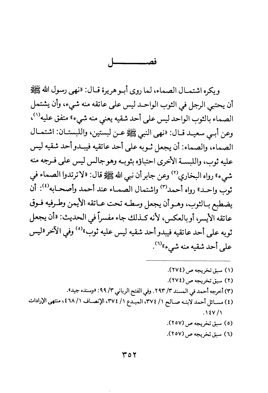 ويكره اشتمال الصماء لما روى أبو هريرة قال: "نهى رسول الله صلى الله عليه وسلم أن يحتبي الرجل الثوب الواحد ليس على عاتقه منه شيء وأن يشتمل الصماء بالثوب الواحد ليس على أحد شقيه يعني منه شيء" متفق عليه وعن أبي سعيد قال: "نهى النبي صلى الله عليه وسلم عن لبستين واللبستان اشتمال الصماء والصماء أن يجعل ثوبه على أحد عاتقيه فيبدو أحد شقيه ليس عليه ثوب واللبسة الأخرى احتباؤه بثوبه وهو جالس ليس على فرجه منه شيء" رواه البخاري وعن جابر بن أن نبي الله صلى الله عليه وسلم قال: "لا ترتدوا الصماء في ثوب واحد" رواه أحمد واشتمال الصماء عند أحمد وأصحابه أن يضطبع بالثوب وهو أن يجعل وسطه تحت عاتقه الأيمن وطرفيه فوق عاتقه الأيسر أو بالعكس لأنه كذلك جاء مفسرا في الحديث أن يجعل ثوبه على أحد عاتقيه فيبدو أحد شقيه ليس عليه ثوب" وفي الآخر: "ليس على أحد شقيه منه شيء".